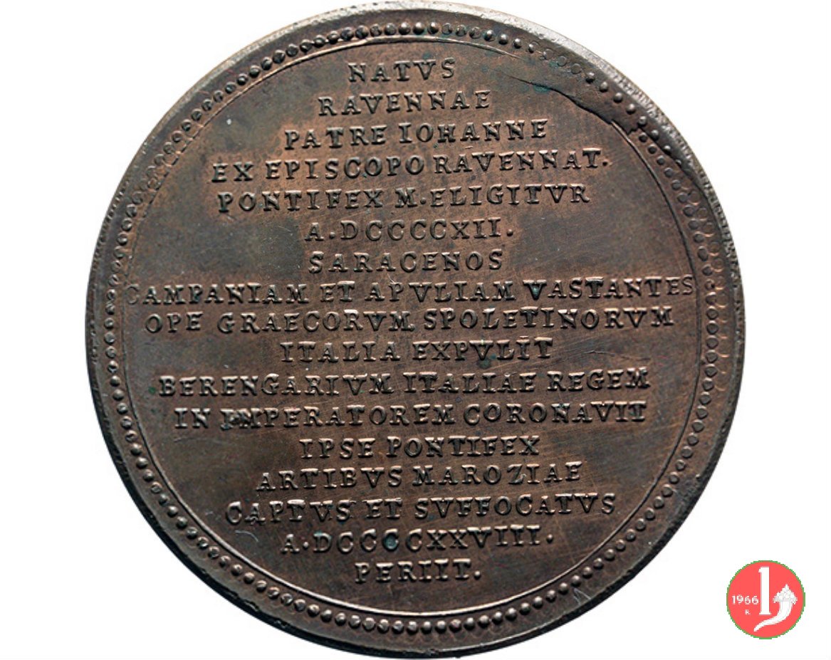 nel campo: NATVS = RAVENNAE = PATRE IOHANNE = EX EPISCOPO RAVENNAT. = PONTIFEX ELIGITVR = A.DCCCCXII. = SARACENOS = CAMPANIAM ET APVLIA VASTATES = POPE GREGORIVM SPOLETINORVM = ITALIA EXPVLIT = BERENGARIVM ITALIAE REGEM = IN IMPERATOREM CORONAVIT = IPSE PONTIFEX = ARTIBVS MAROZIAE = CAPTVS ET SVFFOCATVS = A. DCCCCXXVIII. = PERIIT •