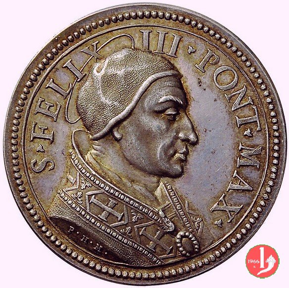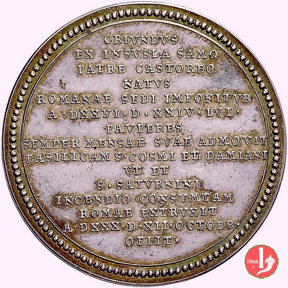 Medaglia coniata dalla Serie di restituzione Papale, comprendente 255 medaglie, realizzate a Norimberga tra il 1700 ed il 1745 dal Governatore della Zecca di Franconia Caspar Gottlieb Lauffer. Dalla documentazione fotografica allegata alla presente scheda risulta che per la presente medaglia sono stati realizzati due conii differenti del Dritto. | ||||||