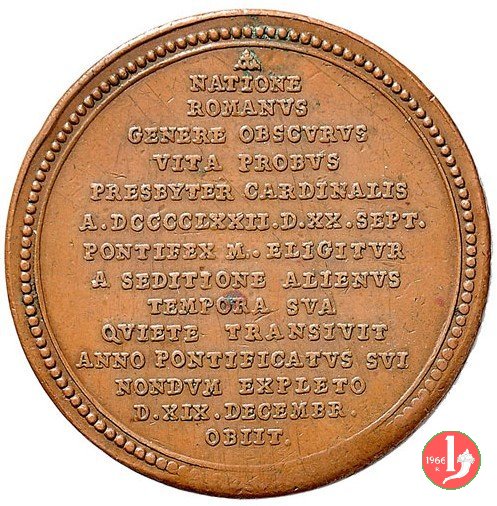 nel campo: fregio = NATIONE = ROMANVS = GENERE OBSCVRVS = VITA PROBVS = PRESBYTER CARDINALIS = A. DCCCCLXXII. D. XX. SEPT. = PONTIFEX M. ELIGITVR = A SEDITIONE ALIENVS = TEMPORA SVA = QVIETE TRANSIVIT = ANNO PONTIFICATVS SVI = NONDVM EXPLETO = D. XIX. DECEMBR. = OBIIT.