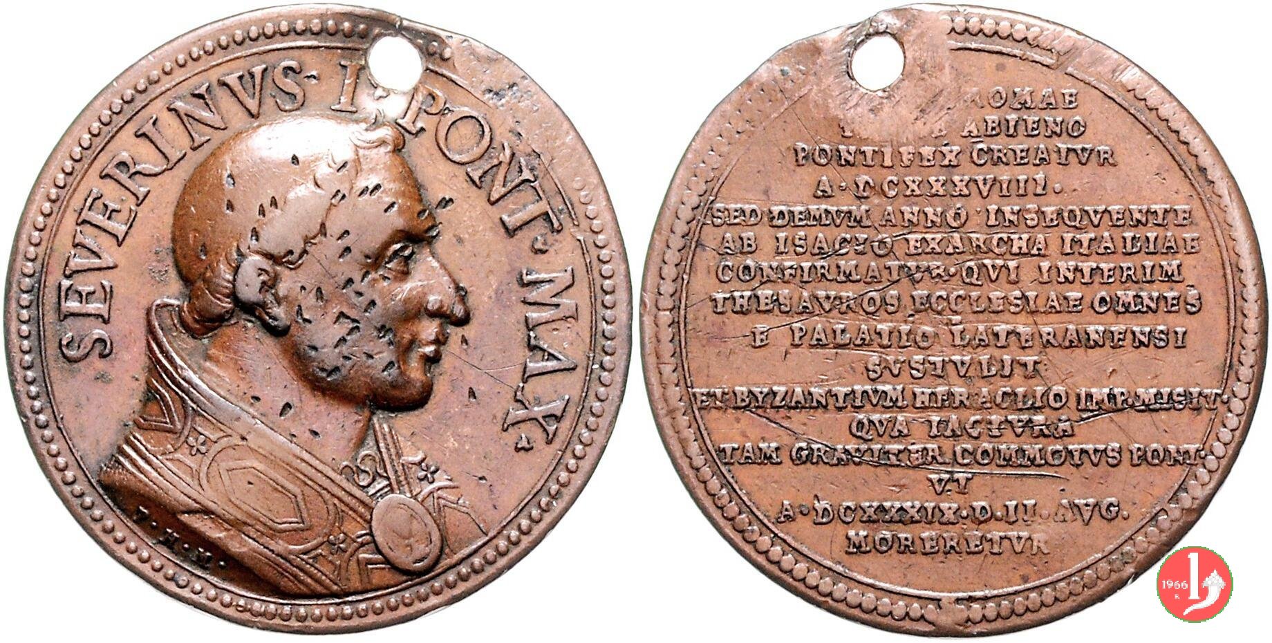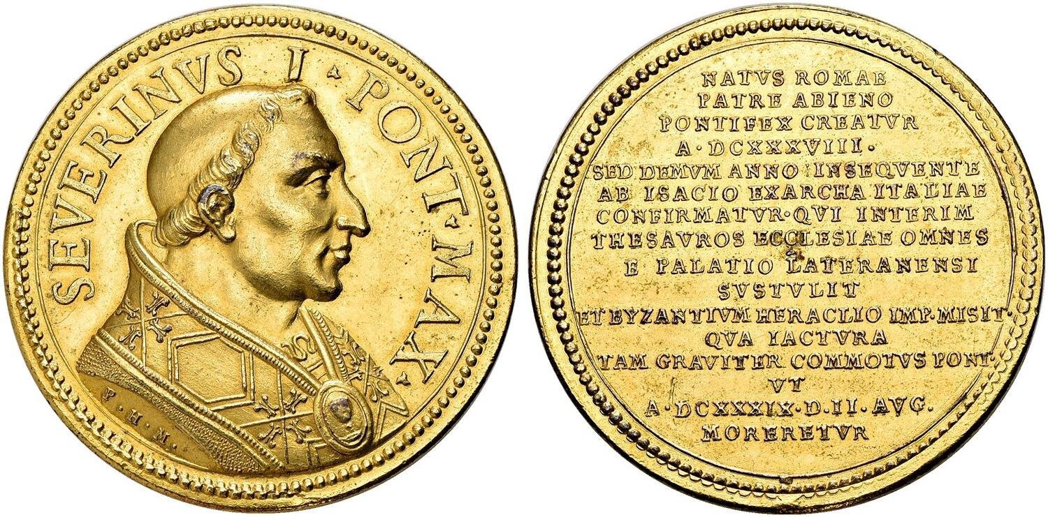 nel campo: NATVS ROMAE = PATRE ABIENO = PONTIFEX ORBATVS = A • DCXXXVIII • = SED DEMVM ANNO INSEQVENTE = AB INSACIO EXARCHA ITALIAE = CONFIRMATVR QVI INTERIM = THESAVROS ECCLESIAE OMNES = R PALATIO LATERANENSI = SVLSTVLIT = ET BISANTIO HERACLIO IMP. MISIT = QVA IACTVRA = QVAM GRAVITER COMMOTVSIONI = VT = A • DCXXXIX • D • II • AVG. = MORBRETVR
