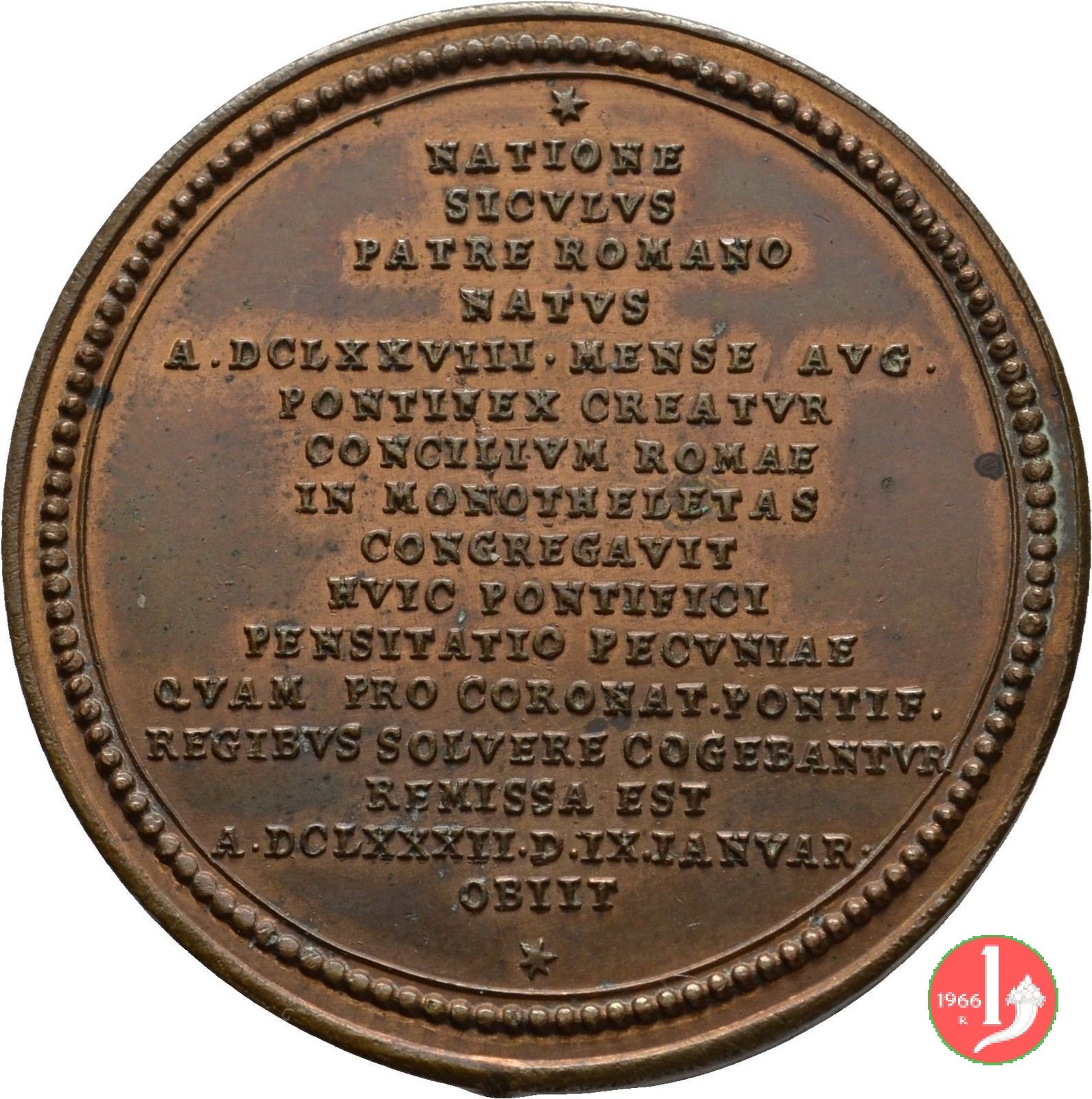 nel campo: * = NATIONE = SICVLVS = PATRE ROMANO = NATVS = A. DCLXXVIII •MENSE AVG • = PONTIFEX CREATVR = CONCILIVM ROMAE = IN MONOTHELETAS = CONGREGAVIT = HVIC PONTIFICI = PENSITATIO PECVNIAE = QVAM PRO CORONAT • PONTIF • = REGIBVS SOLVERE COGEBANTVR = REMISSA EST = A • DCLXXXII • D • IX • IANVAR • = OBIIT = *