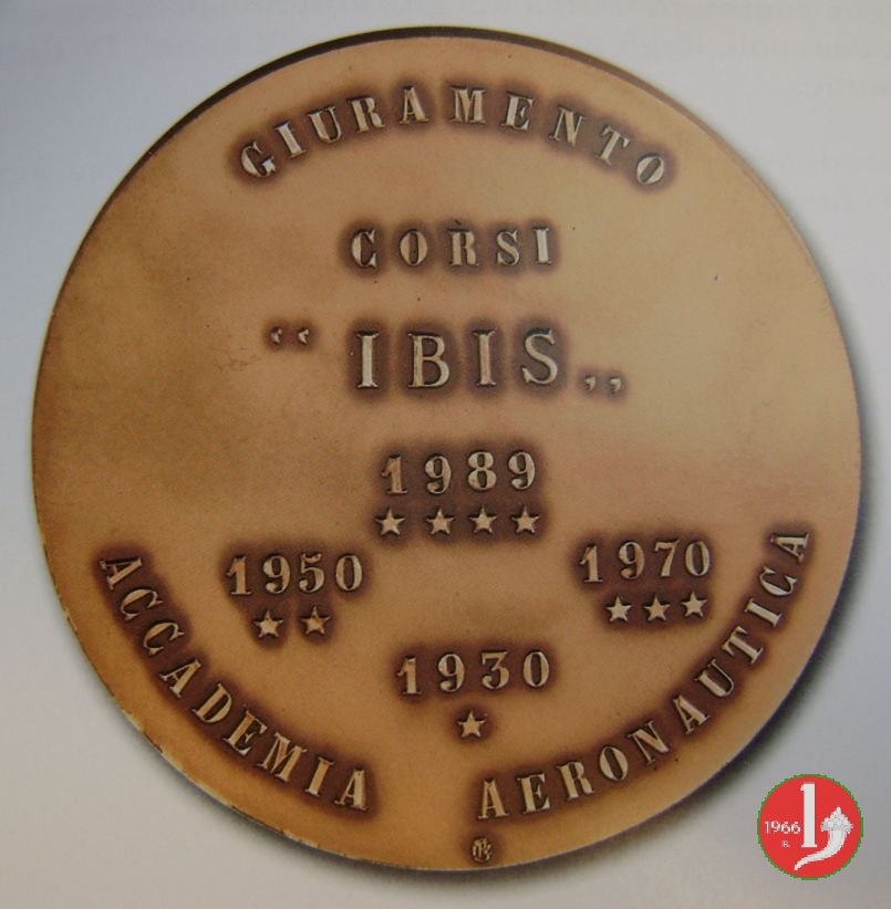 Raffigurazione di figure stilizzate di tre ibis in volo verso destra lungo la linea tracciata da un fulmine e su un originale sfondo di raggi convergenti; intorno una fascia di smalto blu in cui è inciso il motto dei corsi Ibis; sotto la firma dell'artista e la data. Nel giro ACCADEMIA AERONAUTICA; su un piano inclinato un'aquila da pilota militare e il numero di stelle che indicano la successione cronologica del corso; nel campo nella parte superiore di un disco rialzato la scritta GIURAMENTO CORSI / IBIS / e nella parte inferiore, le date dei corsi con le stellette, nell'esergo località, data e luogo del giuramento.