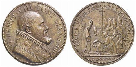 Medaglia originale, emessa il 04-10-1626, per la posa della prima pietra nella Chiesa di S. Maria della Concezione. Il conio del rovescio di questa medaglia non è pervenuto al Mazio. Il diritto è stato riutilizzato per altre coniazioni con interventi di restauro. | ||||||