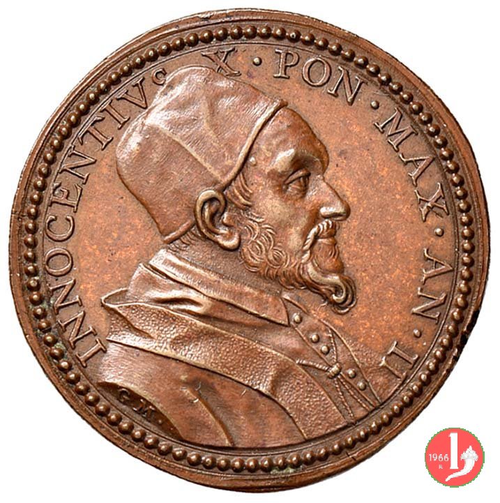 | Medaglia coniata, emessa il 15-09-1645 per ricordare il primo anniversario dell'elezione al soglio pontificio di Innocenzo X. | |||||||