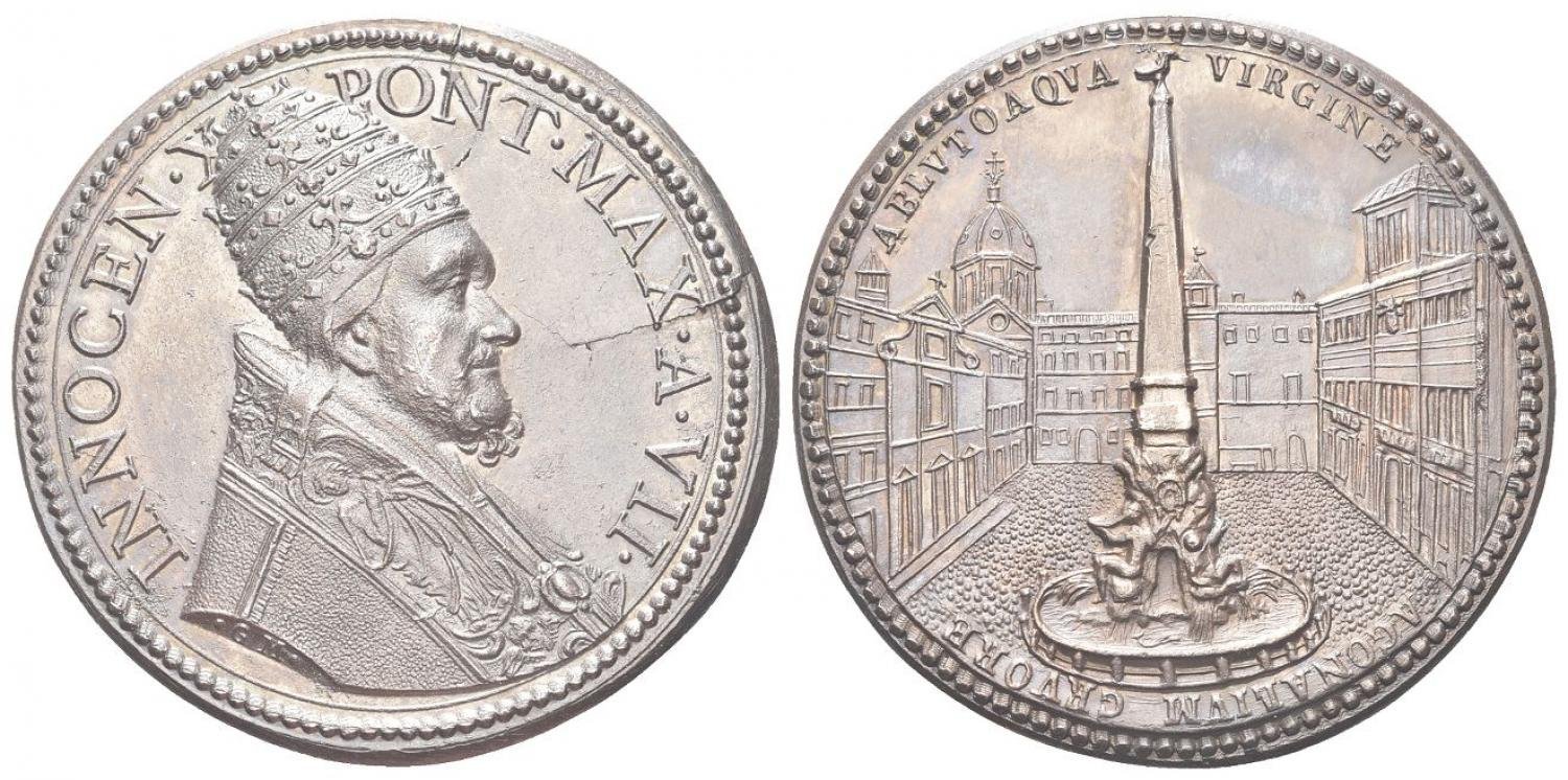 Medaglia coniata, realizzata per celebrare il completamento delle opere di costruzione della Fontana dei Quattro Fiumi, realizzata su progetto di Gian Lorenzo Benini, in Piazza Navona a Roma.