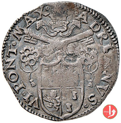 °__ADRIANVS°__VI°PONT°MAX° /Stemma semiovale gigliato, sormontato da chiavi decussate con cordone e fiocco e da tiara S •PETRVS__S •PAVLVS /i due Santi nimbati in piedi; S.Pietro volto a destra con chiave e libro, S.Paolo di fronte con spada e libro. In basso tra i 2 Santi il segno di zecca; in Esergo •MARC •