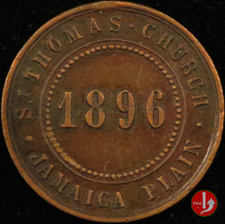 Medaglia coniata, emessa nel 1896 per ricordare la costruzione della Chiesa di San Tommaso d'Aquino a Jamaica Plain (Boston).