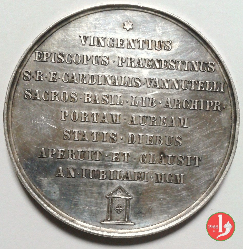 * = VINCENTIUS = EPISCOPUS • PRAENESTINUS = S • R • E • CARDINALIS • VANNUTELLI = SACROS • BASIL • LIB • ARCHIPR • = PORTAM • AUREAM = STATIS • DIEBUS = APERUIT • ET - CLAUSIT = AN • IUBILAEI • MCM = la Porta Santa
