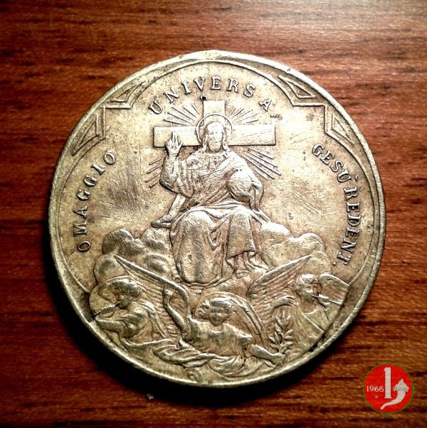 Medaglia coniata, emessa a ricordo del giubileo secolare del 1900. Della stessa medaglia esistono alcune lievi varianti: nelle legende, nelle rappresentazioni e nelle cornici. | |||||