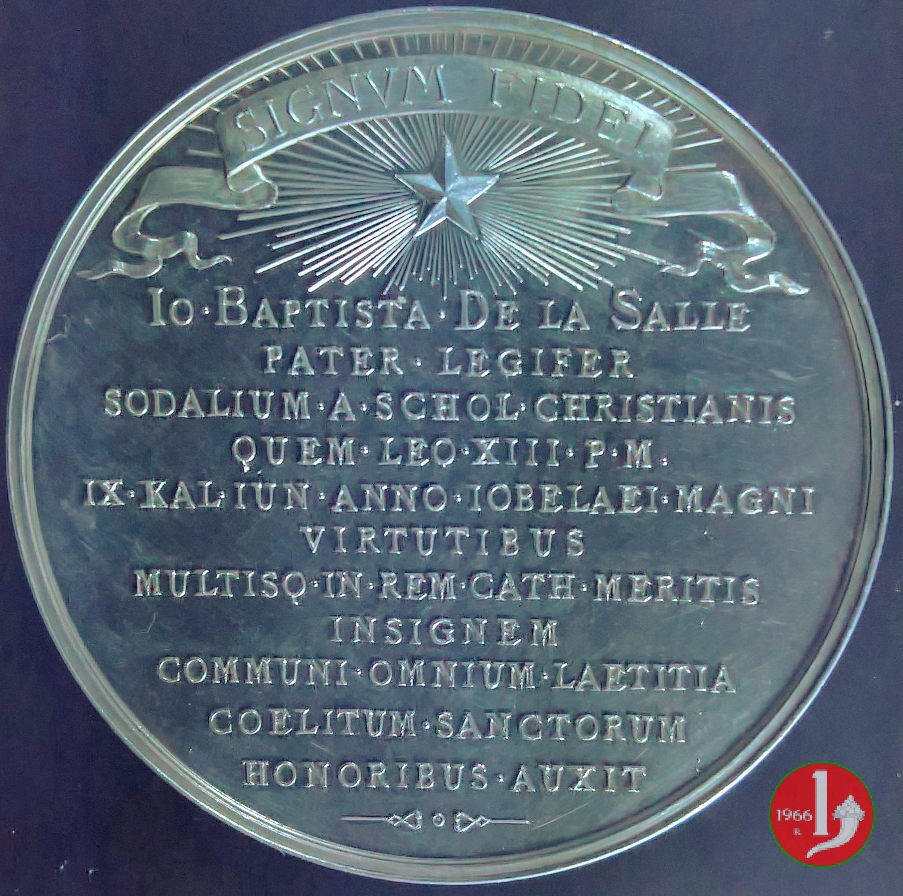 nel campo: IO • BAPTISTA DE LA SALLE = PATER • LEGIFER = SODALIUM • A • SCHOL • CHRISTIANIS = QUEM • LEO • XIII • P • M • = IX • KAL • IUN • ANNO • IOBELAEI • MAGNI = VIRUTIBUS = MULTISQ • IN • REM • CATH • MERITIS = INSIGNEM = COMMUNI • OMNIUM • LAETITIA = COELITUM • SANTORUM = HONORIBUS • AUXIT
