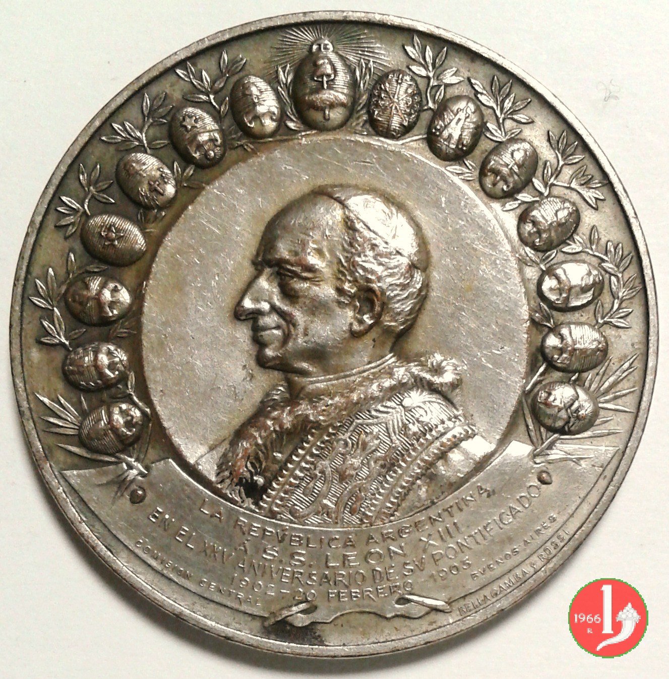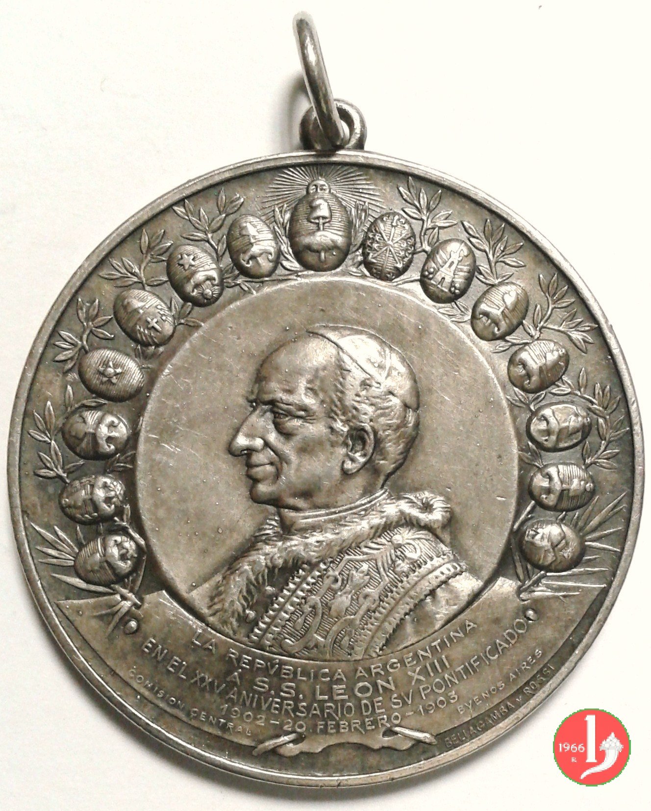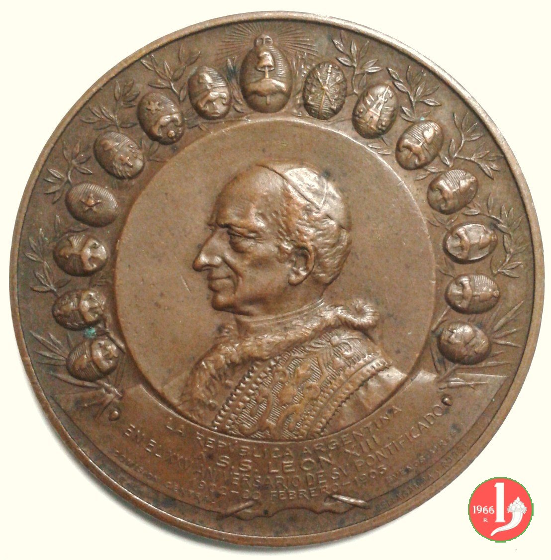 Medaglia coniata, emessa nel 1903 in Argentina, per ricordare il 25° Anniversario di Pontificato di Leone XIII.