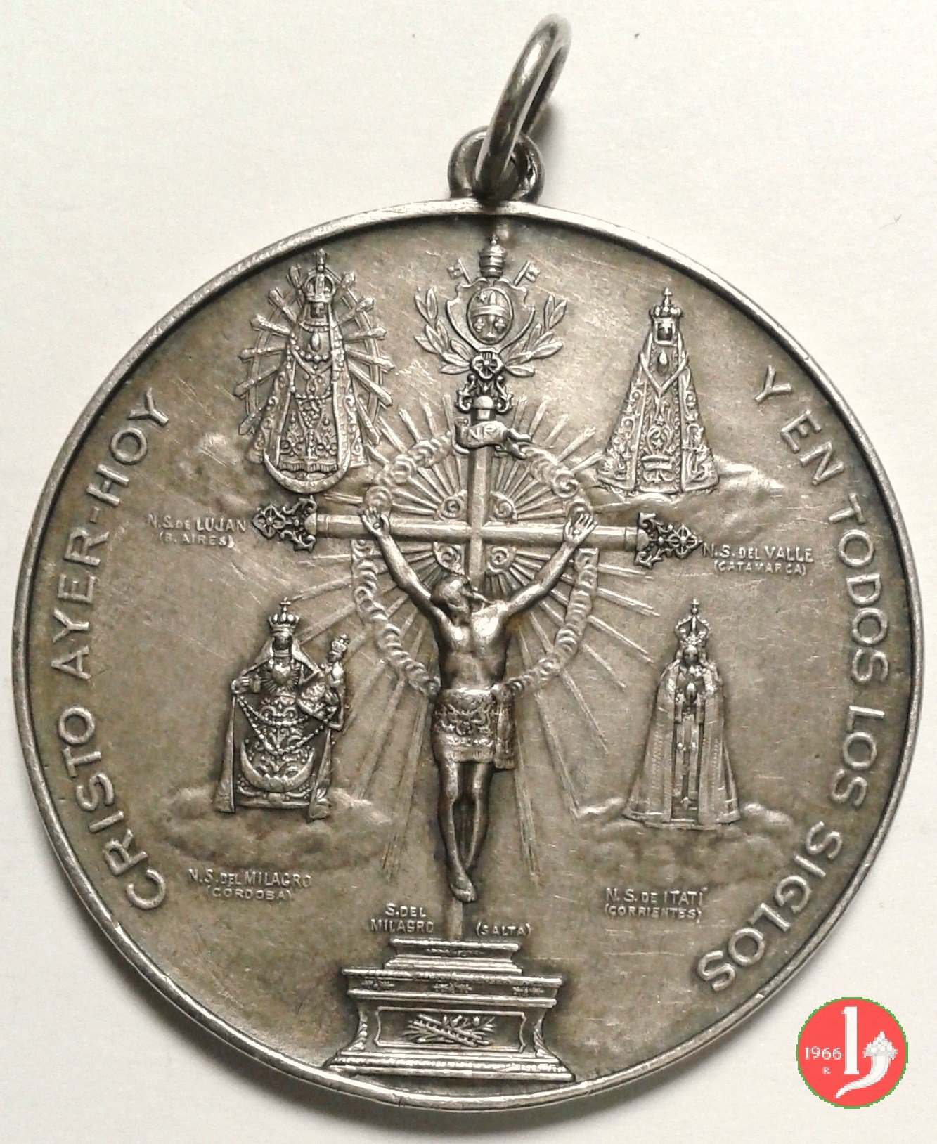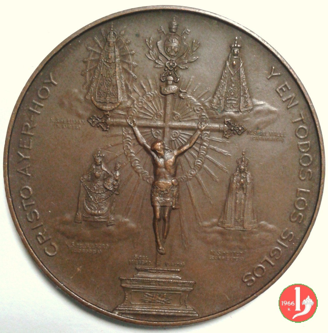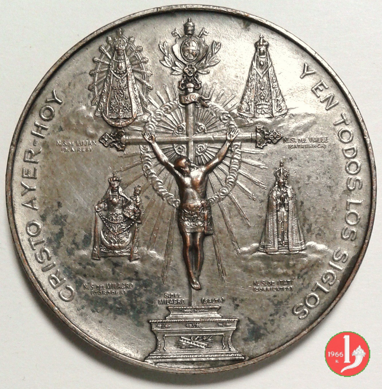 Crocifissione raggiante su nimbo di nubi appoggia su altare, attorno quattro immagini della B.V. su nubi e coronate N.S. DEL MI L'AGRO _ N.S. DE LUJAN _ N.S. DEL VALLE _ N.S. DEL IATI' , in alto Stemma Papale su chiavi decussate, coronato da triregno, tra rami di alloro