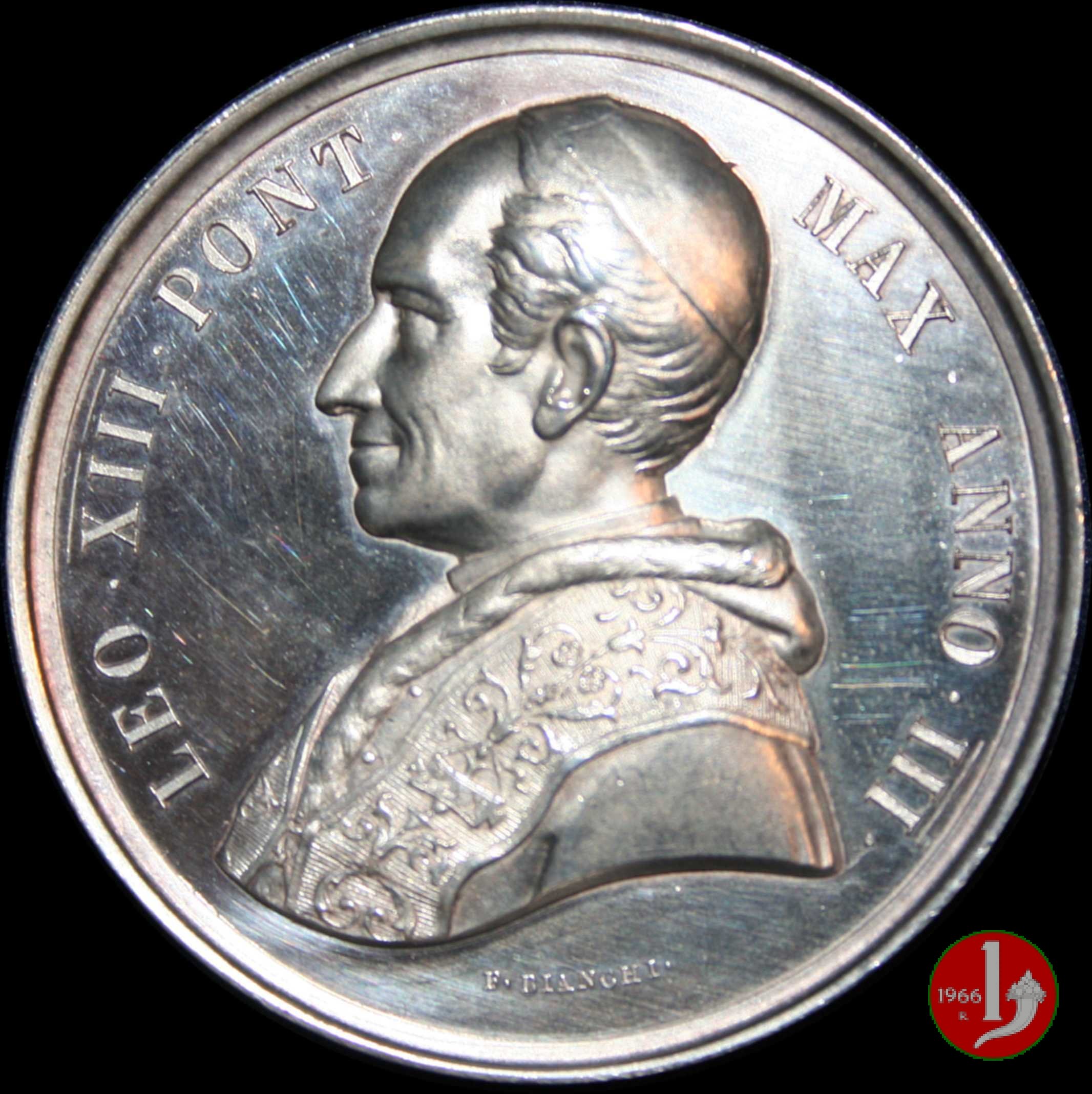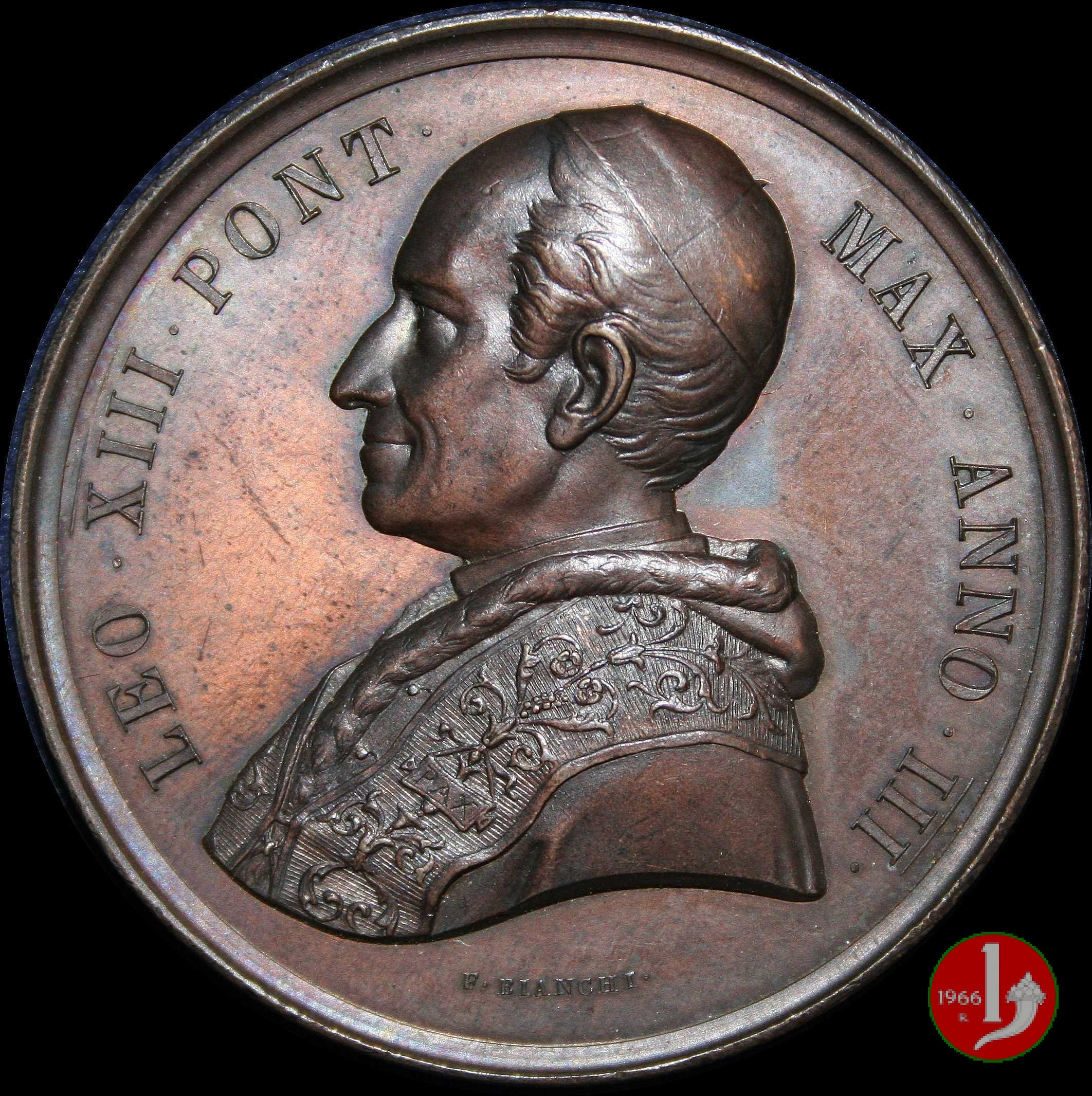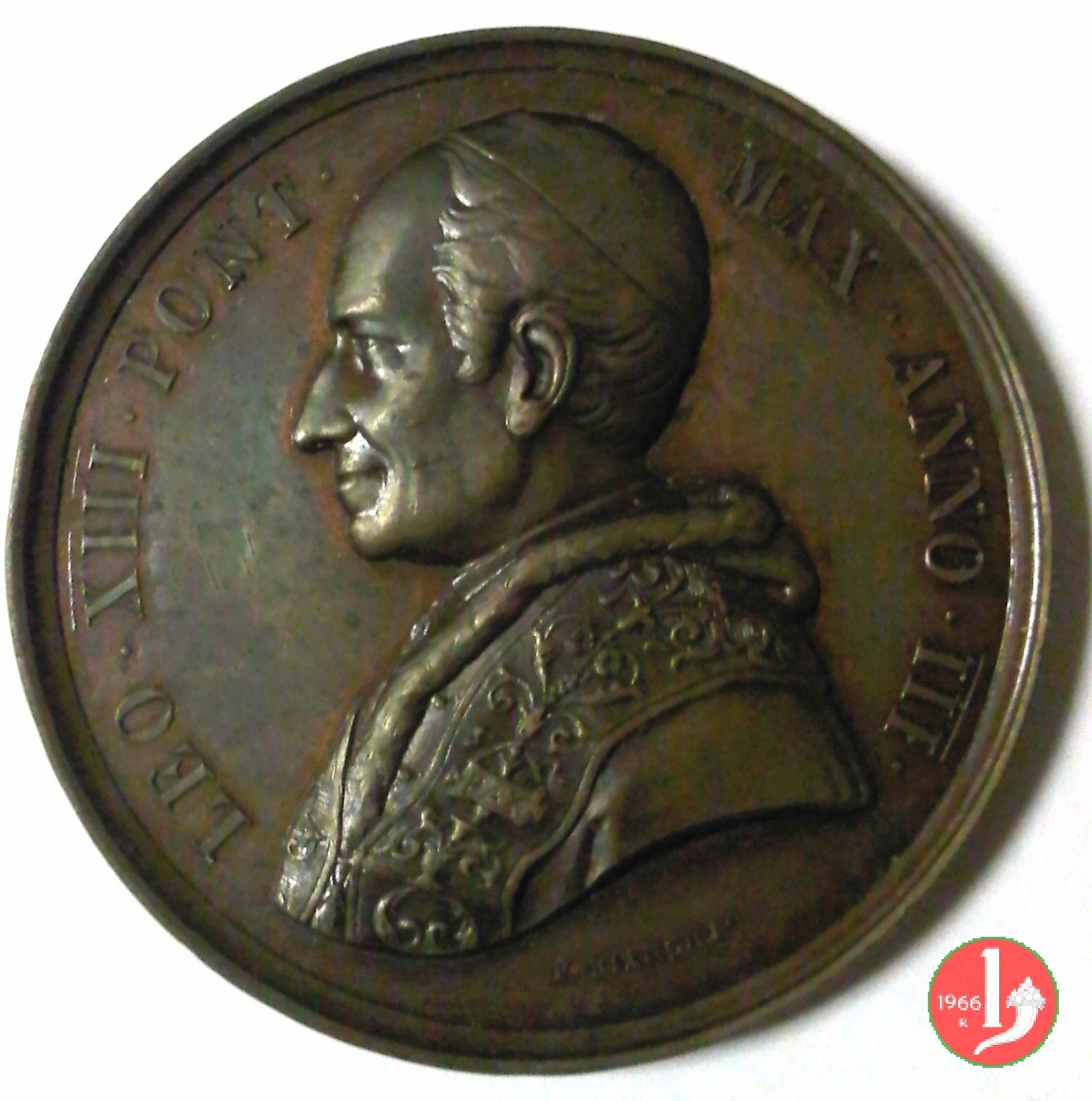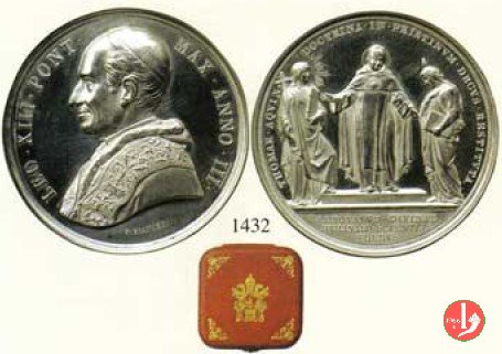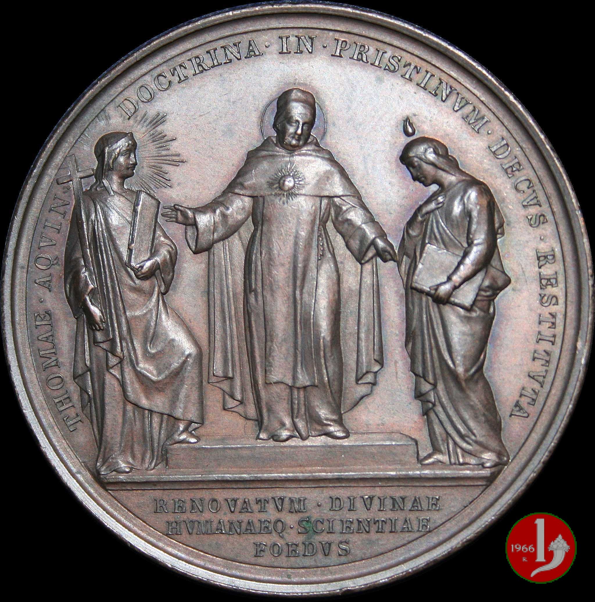 Medaglia annuale coniata, emessa il 29-06-1880, a ricordo della promulgazione della lettera Enciclica Aeterni Patris con dell'impulso allo studio dell'opera di San Tommaso D'Aquino. Con l'enciclica "Aeternis Patris", promulgata il 04-08-1879, il Pontefice diede nuovo slancio allo studio delle teoria filosofica di San Tommaso e di altri Dottori della Chiesa indicandone le opere come mezzi per raggiungere, con la ragione, alla comprensione dei misteri della fede. Testo integrale dell'enciclica in italiano sul sito della Santa Sede: