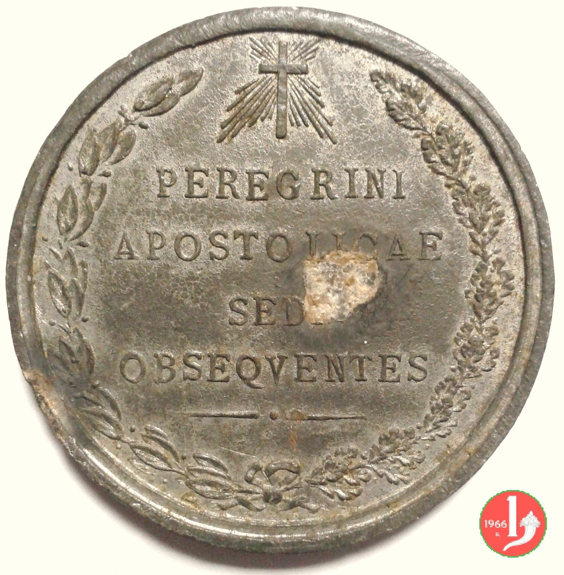entro rami di alloro e di quercia legati da nastro in basso e sormontata da Crocefisso raggiante: PEREGRINI = APOSTOLICAE = SEDI = OBSEQVENTES