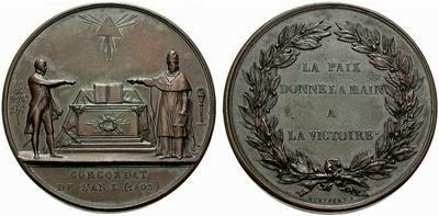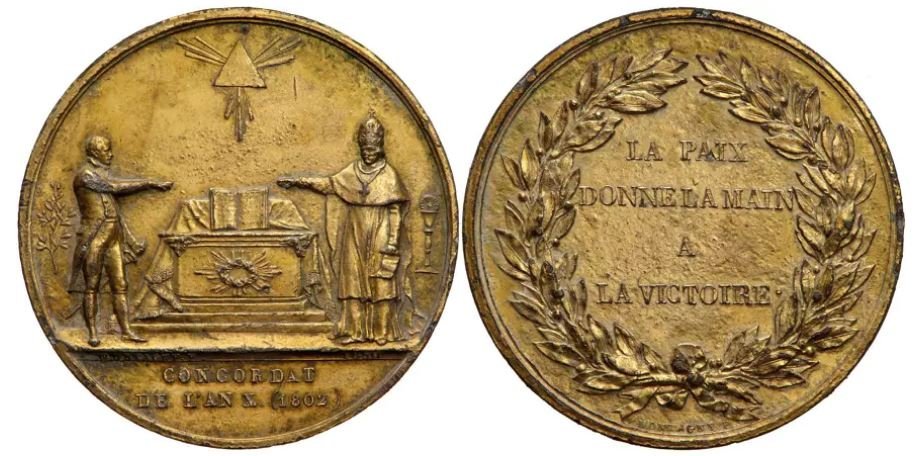 Medaglia coniata in Francia, emessa a ricordo della modifica unilaterale del Concordato fra la Santa Sede e la Francia in data 18-04-1802. Fà parte della serie Napoleonica.