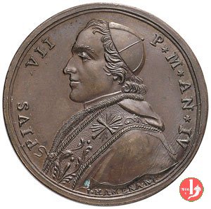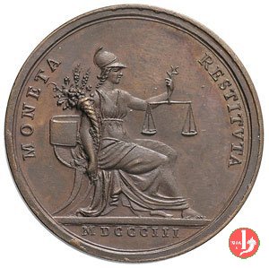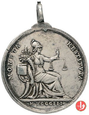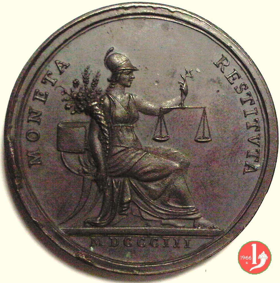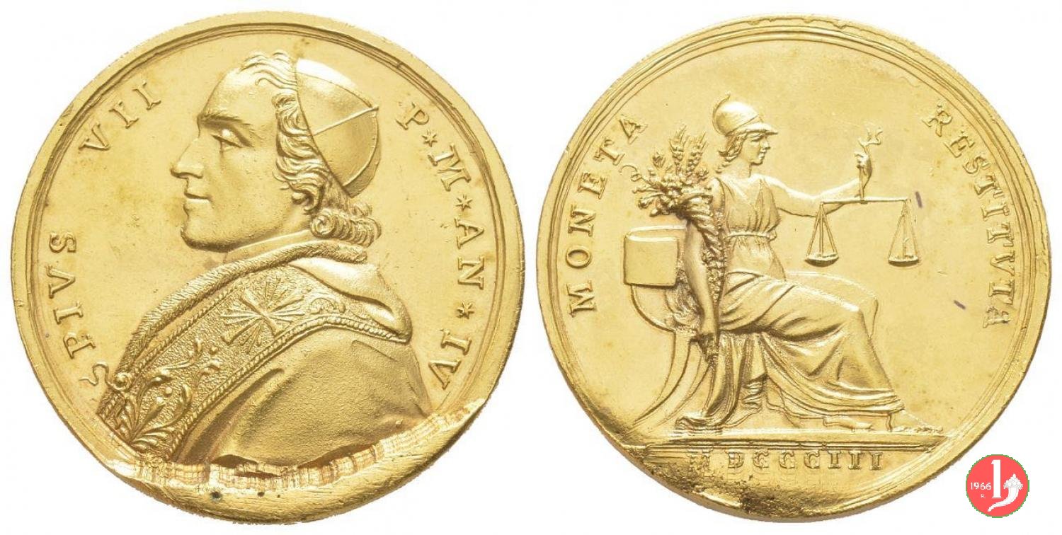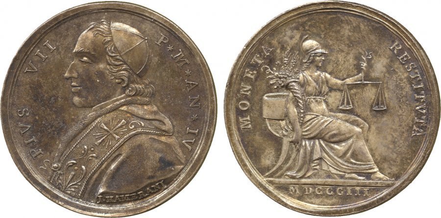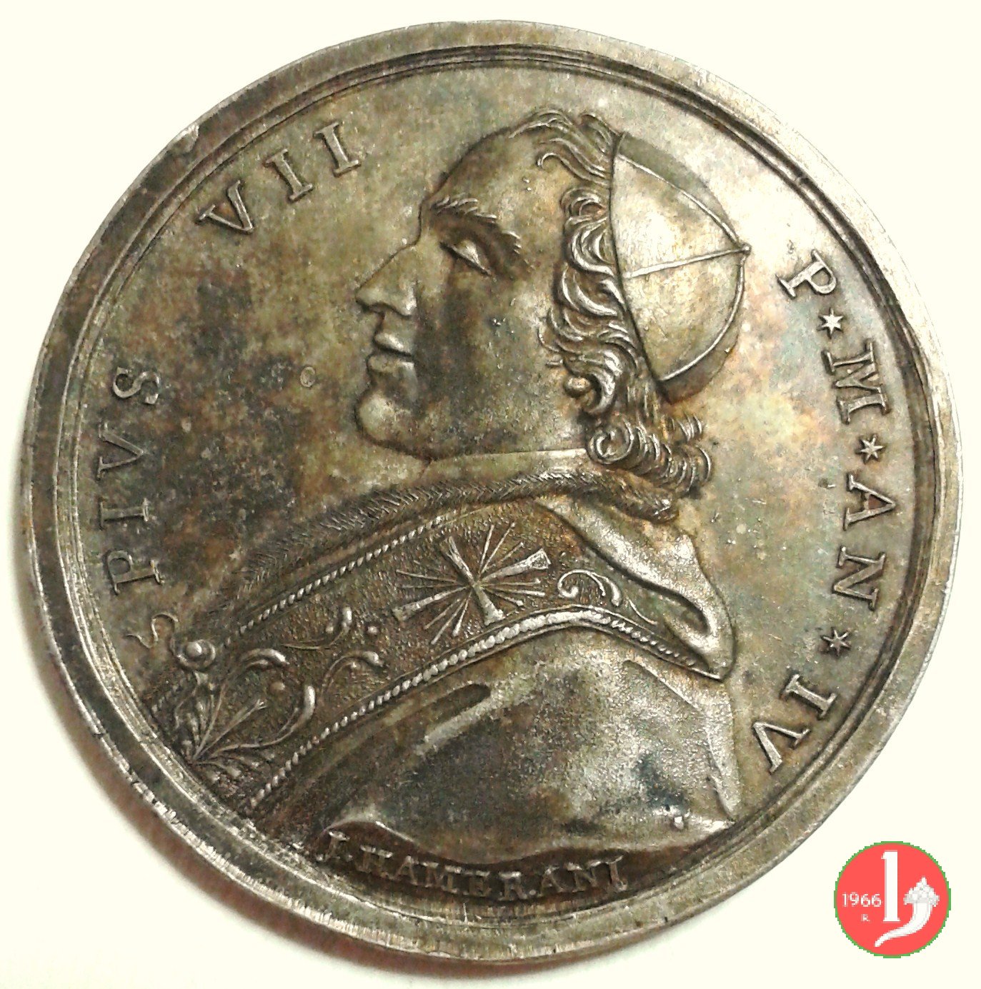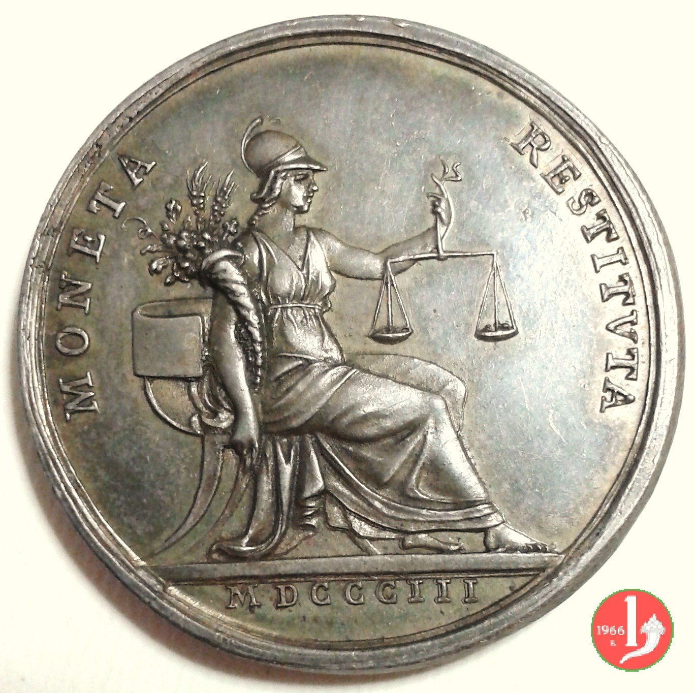 Medaglia annuale coniata, emessa il 29-06-1803, per ricordare il nuovo assetto di controllo finanziario dello Stato. Vi sono due coni del diritto. L'originale ha firma J.Hamerani. La firma nel riconio successivo è I. Hamerani (vedasi Mazio 542) | |||||||