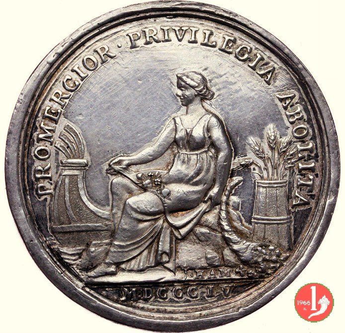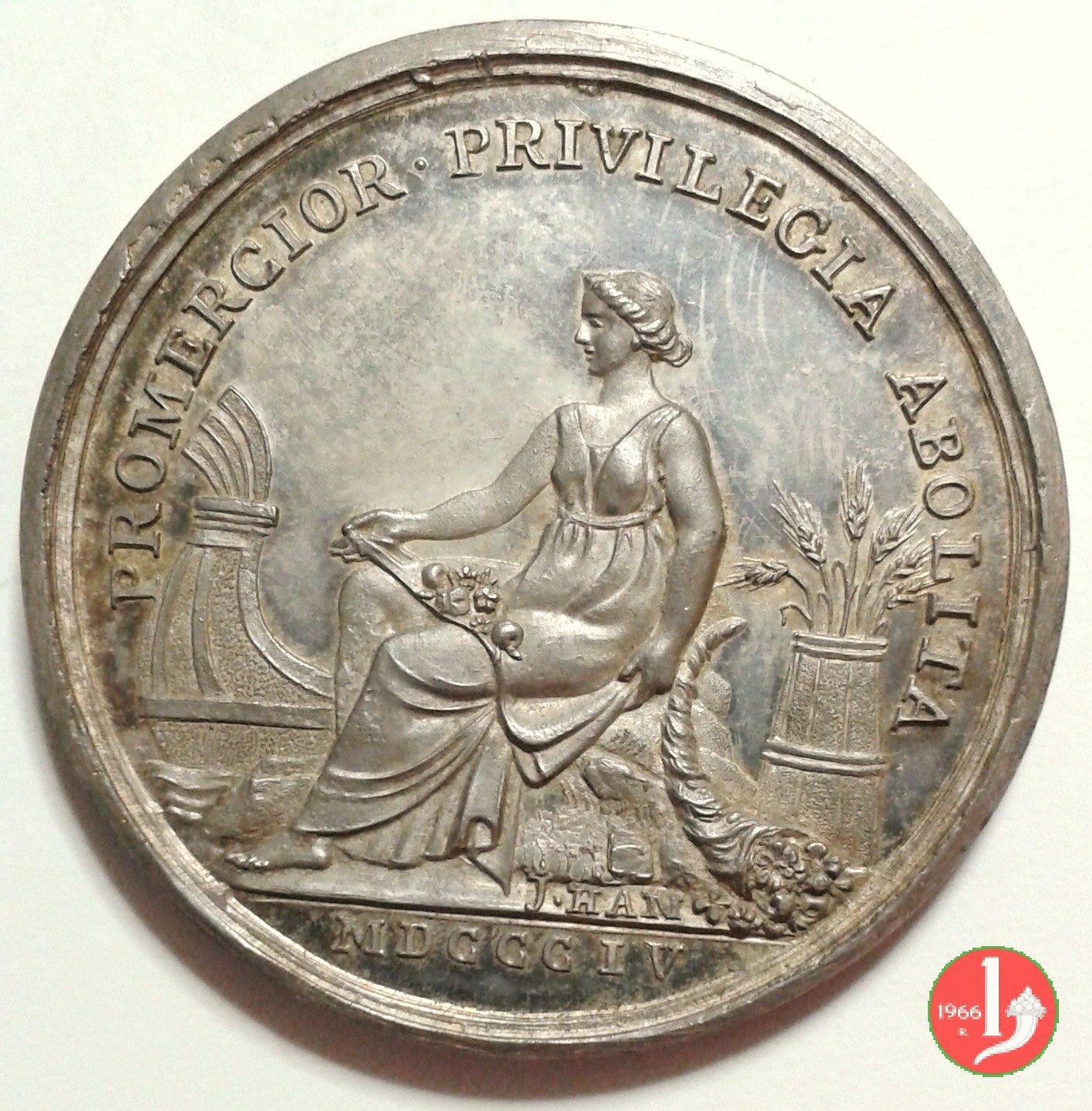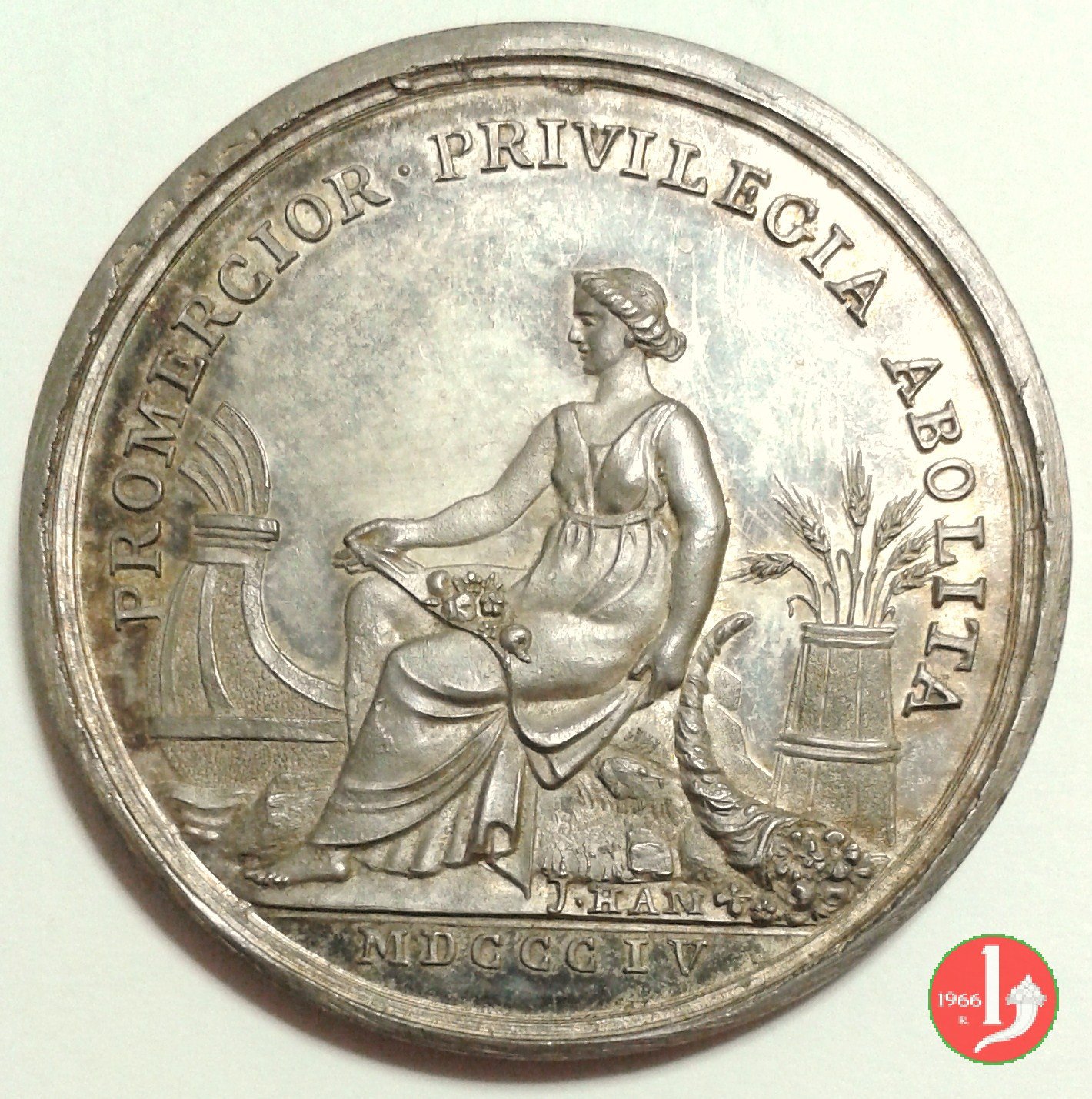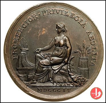 Medaglia annuale emessa il 29-06-1804 a ricordo dell'abolizione dei dazi doganali e della riforma dell'attività agricola. Vi sono due coni del rovescio, con diverse piccole differenze. Si differenzia la firma ma anche ritratto e spighe.(v. Mazio 543) | |||||||