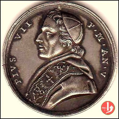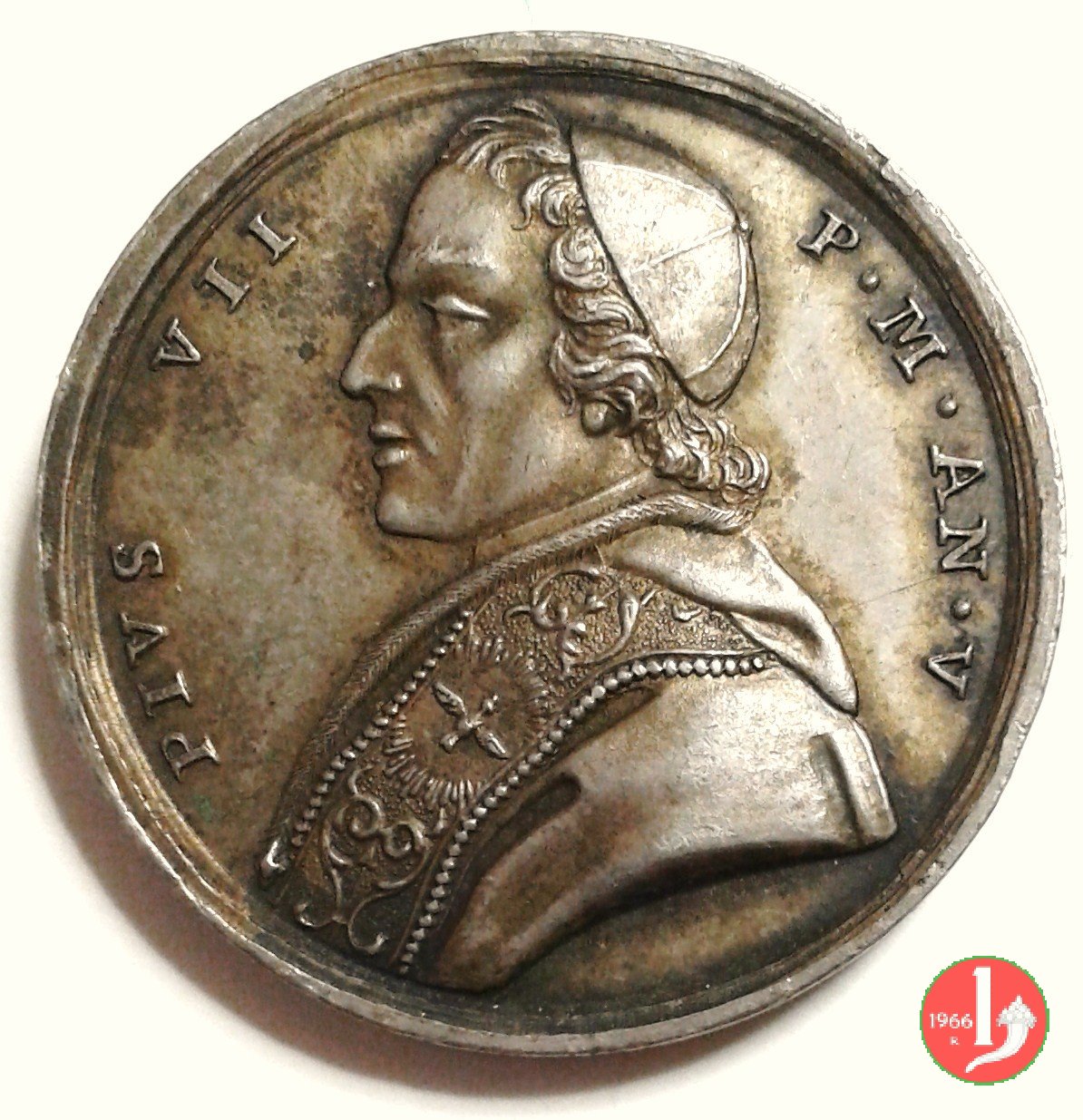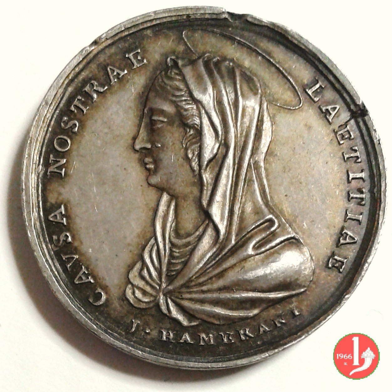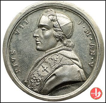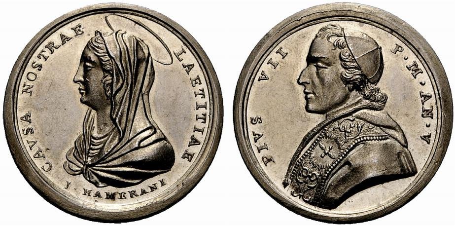 Medaglia straordinaria coniata, di devozione alla B. V. Maria, emessa nel 1804 in occasione del viaggio a Parigi del Pontefice. Esistono due tipi. Questo è il Tipo II carente della firma dell'incisore al D e con stola ornata dalla colomba dello Spirito Santo raggiante. | |||||||||||||||||