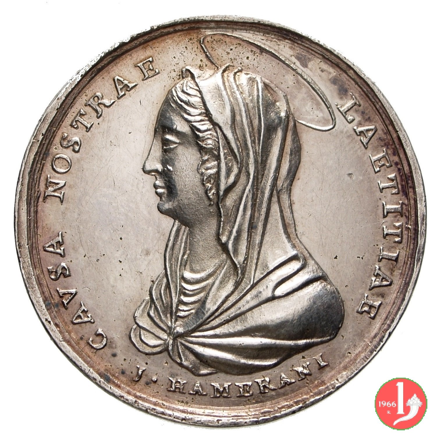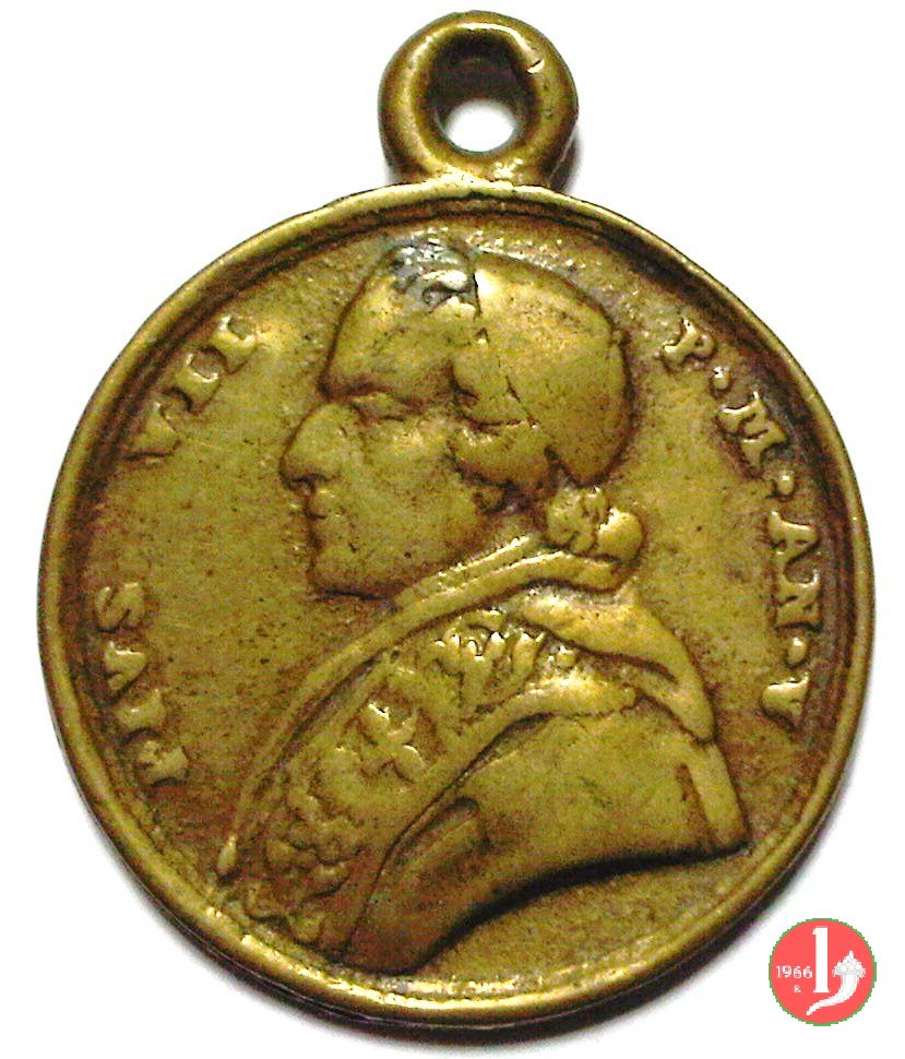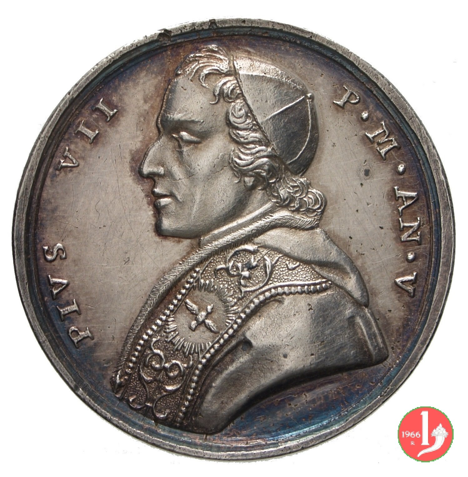 Medaglia straordinaria coniata, di devozione alla B. V. Maria, emessa nel 1804 in occasione del viaggio a Parigi del Pontefice. Esistono due tipi. Questo è il Tipo II carente della firma dell'incisore al D e con stola ornata dalla colomba dello Spirito Santo raggiante. | |||||||||||||||||