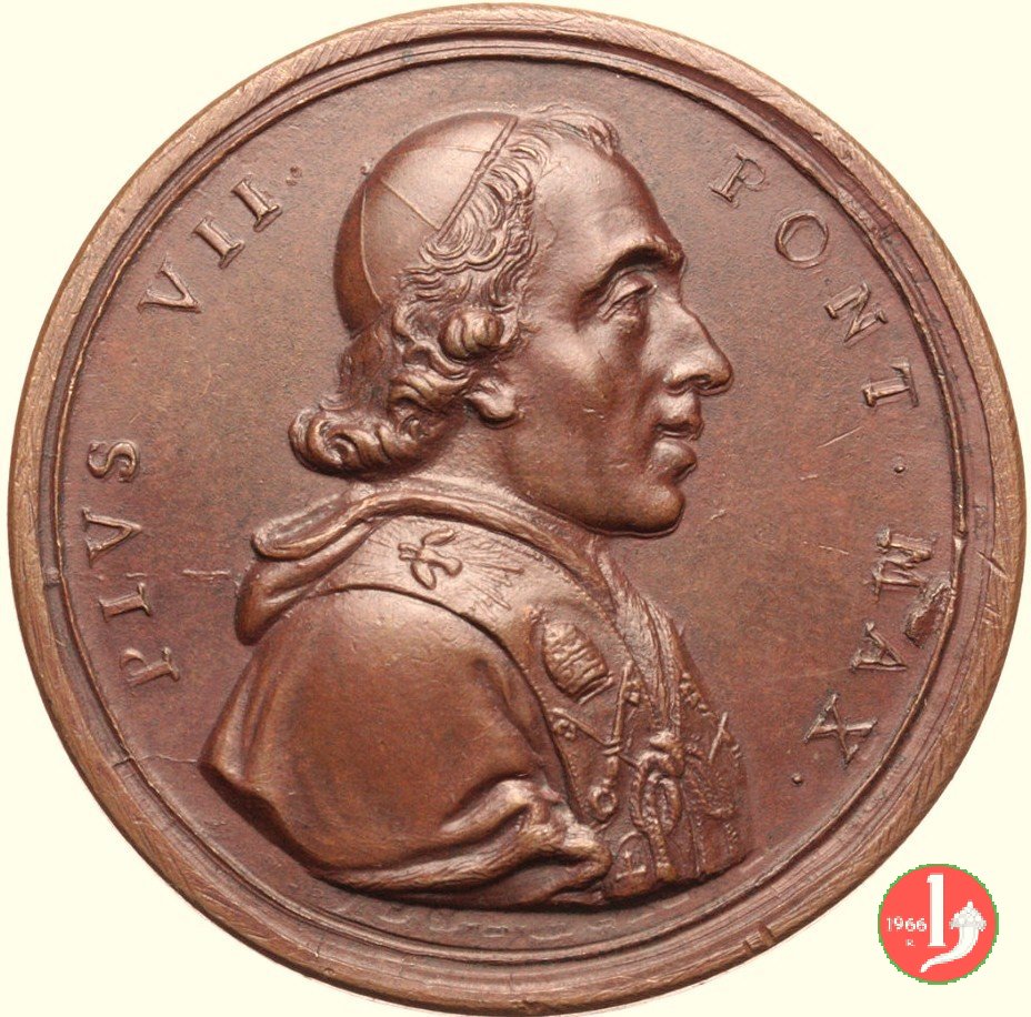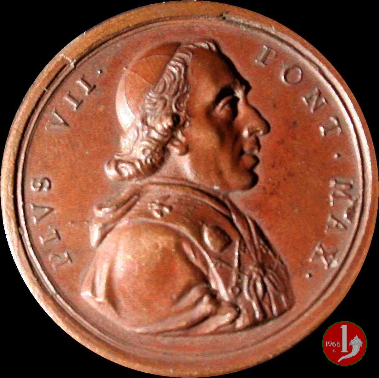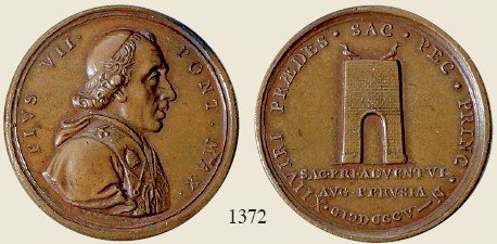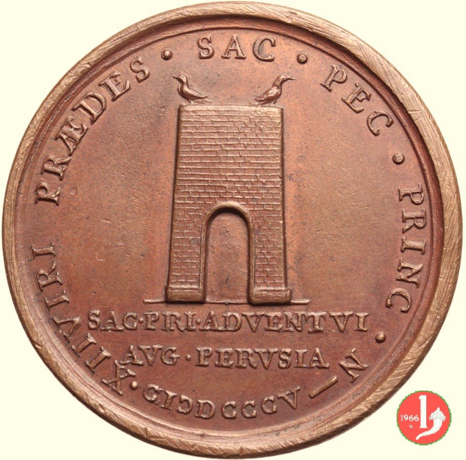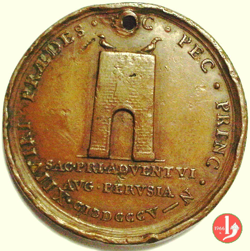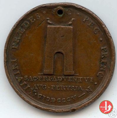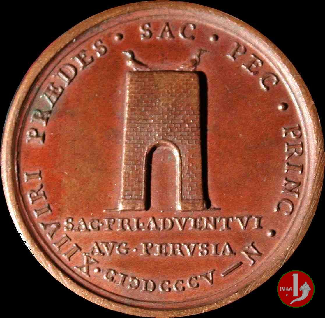 Medaglia straordinaria coniata, emessa il 11-05-1805, per ricordare la visita a Perugia di Pio VII. II Tipo per Patrignani e III tipo per Bertuzzi: con al verso PRAEDES. | |||||||