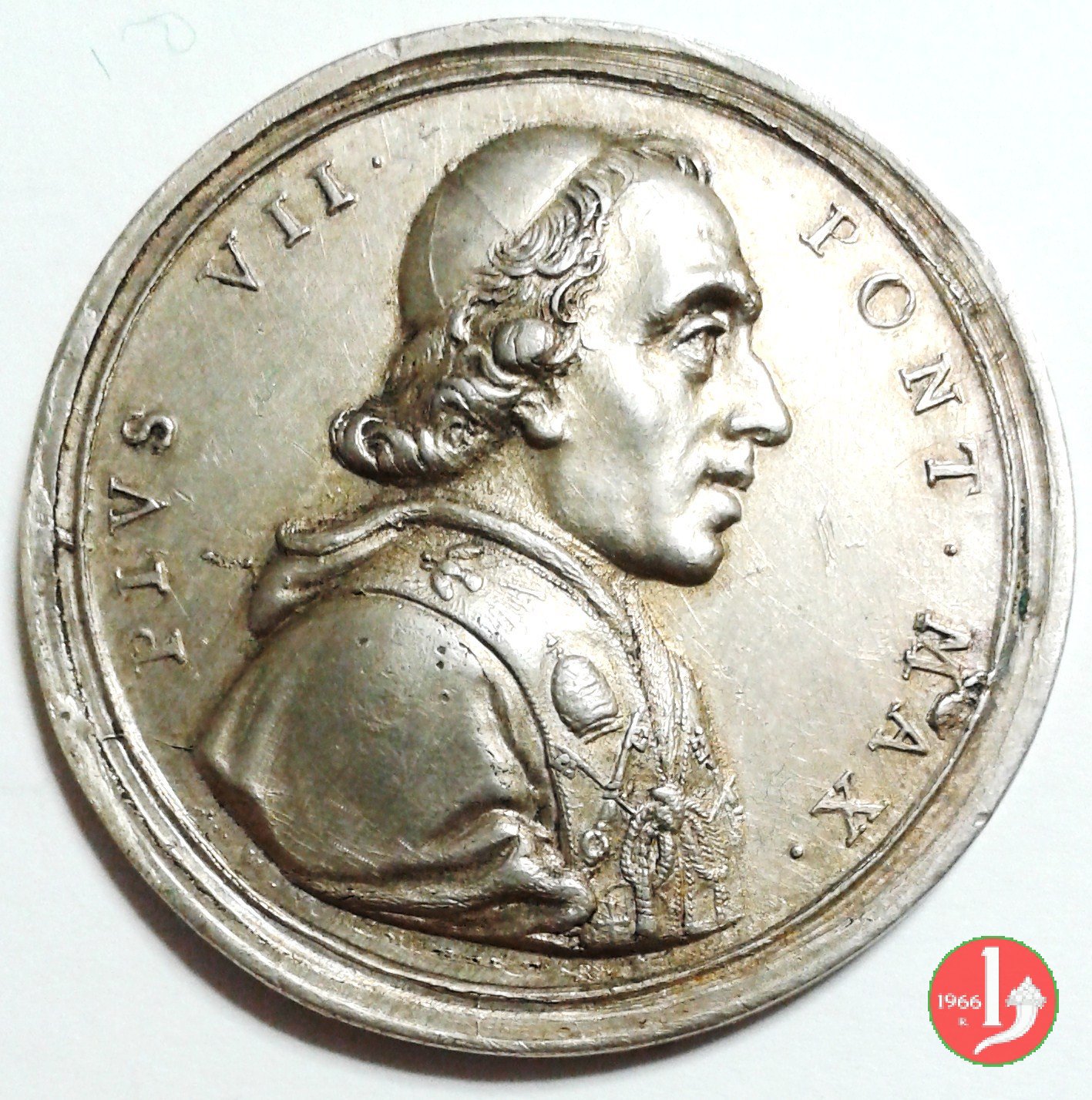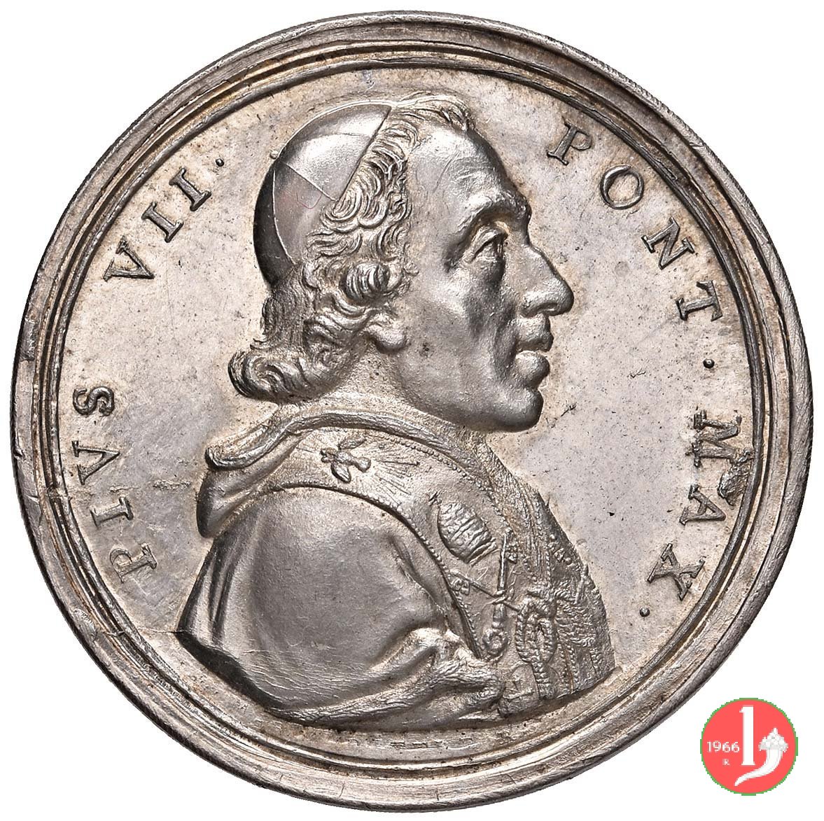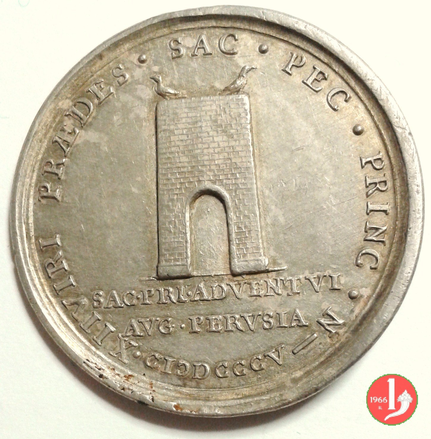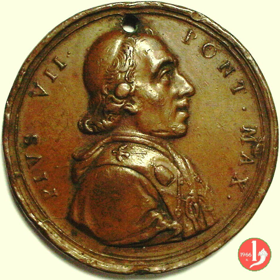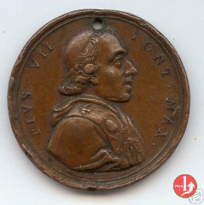 Medaglia straordinaria coniata, emessa il 11-05-1805, per ricordare la visita a Perugia di Pio VII. II Tipo per Patrignani e III tipo per Bertuzzi: con al verso PRAEDES. | |||||||