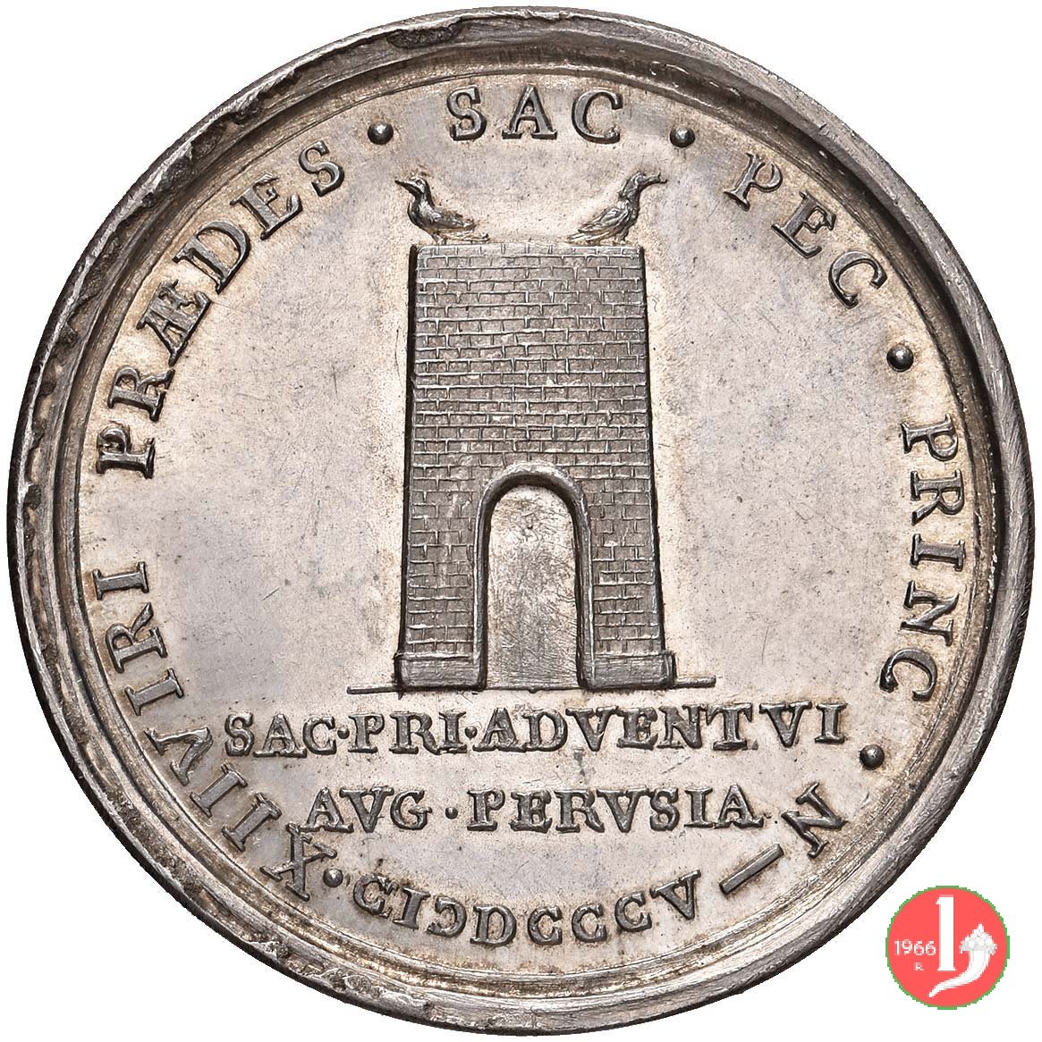 Medaglia straordinaria coniata, emessa il 11-05-1805, per ricordare la visita a Perugia di Pio VII. II Tipo per Patrignani e III tipo per Bertuzzi: con al verso PRAEDES. | |||||||