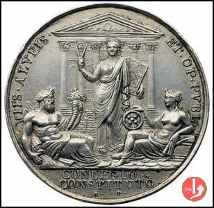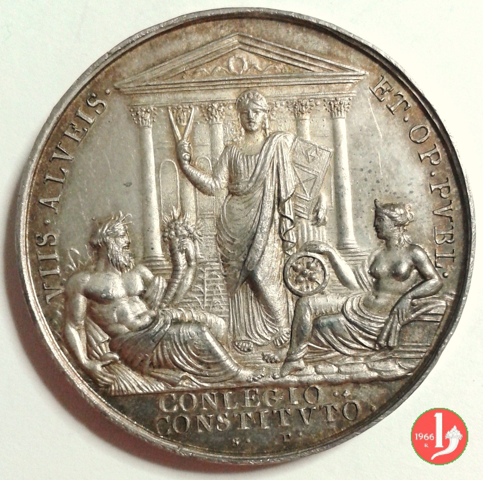 figura in piedi di fronte a tempio rappresentante l'architettura, ai suoi lati figure assise: a sx il Tevere con cornucopia versa acqua da un vaso; a dx la Strada reca ruota