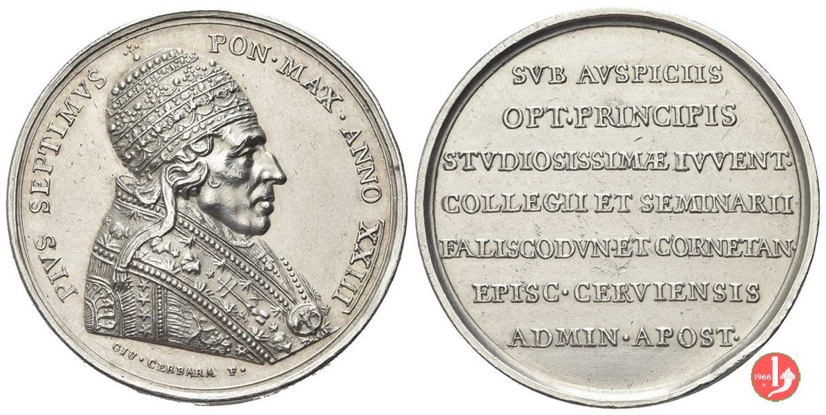 Medaglia premio coniata, realizzata nel 1822 per il seminario di Montefiascone (vedasi anche le altre emissioni per i Pontificati di Pio VII - Pio VIII - Leone XII e Gregorio XVI). Utilizza il conio del D dell'annuale Anno XXIII con il conio del V del Collegio di Montefiascone già utilizzato nell'anno XVII e XXII. | |||||||