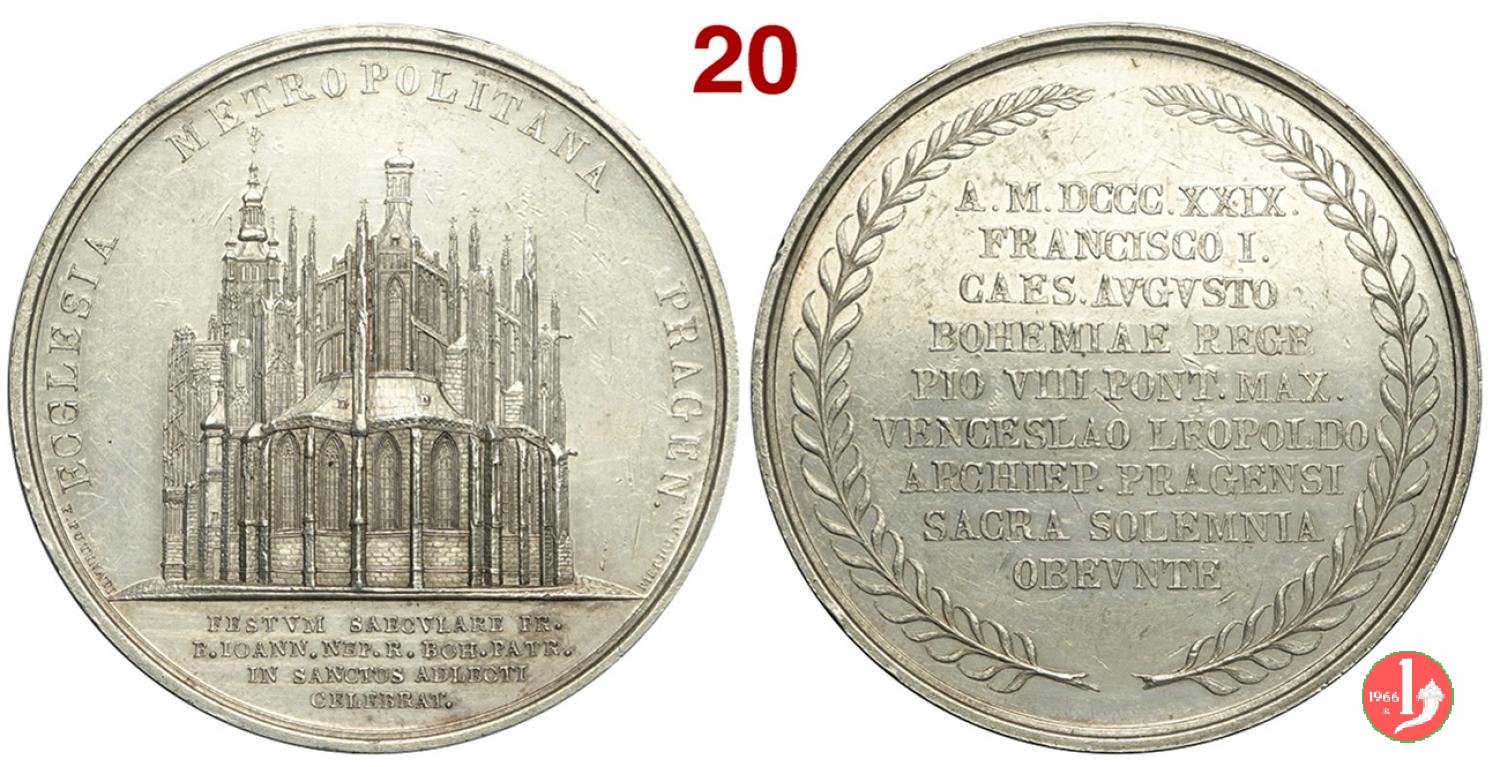 | Medaglia straordinaria coniata, emessa nel 1829, per ricordare i festeggiamenti a Praga in occasione del centesimo Anniversario dalla Canonizzazione di San Giovanni Nepomuceno. | |||||||