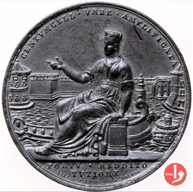 Figura muliebre turrita seduta verso sx allegorica della città di Civitavecchia indica il nuovo molo sullo sfondo