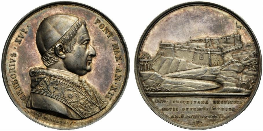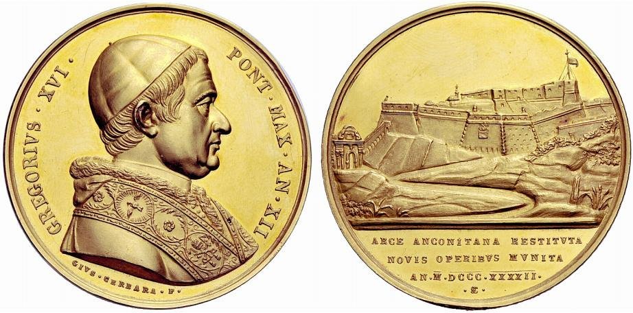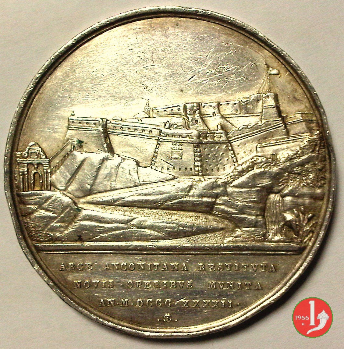 | Medaglia annuale coniata, emessa il 29-06-1842, per ricordare le opere di restauro eseguite alla Fortezza di Ancona. | ||||||||