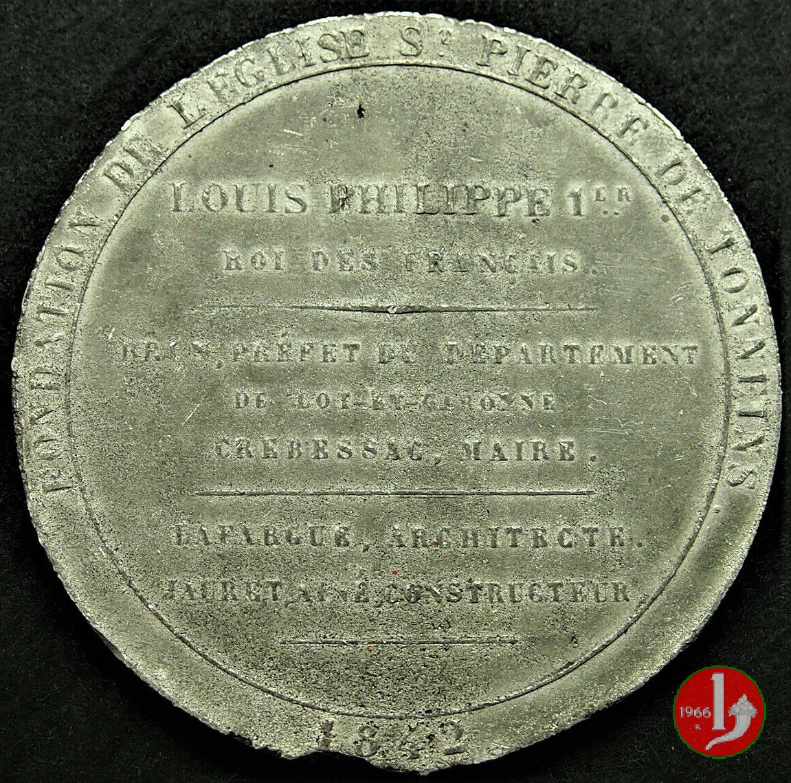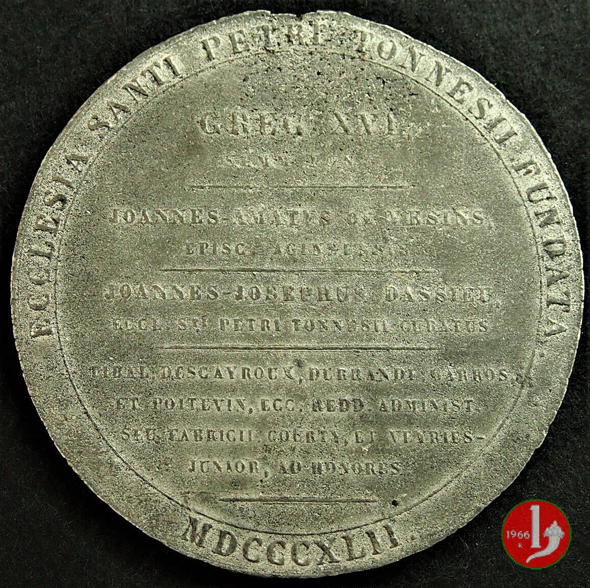 | Medaglia fusa, realizzata nel 1842 a ricordo della fondazione della Chiesa di San Pietro in Tonneins (Francia). | ||||