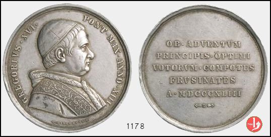 Medaglia straordinaria coniata emessa il 03-05-1843 in occasione della visita del Papa alla Città di Frosinone e nelle Provincie meridionali, per controllare i lavori del Porto di Terracina.
