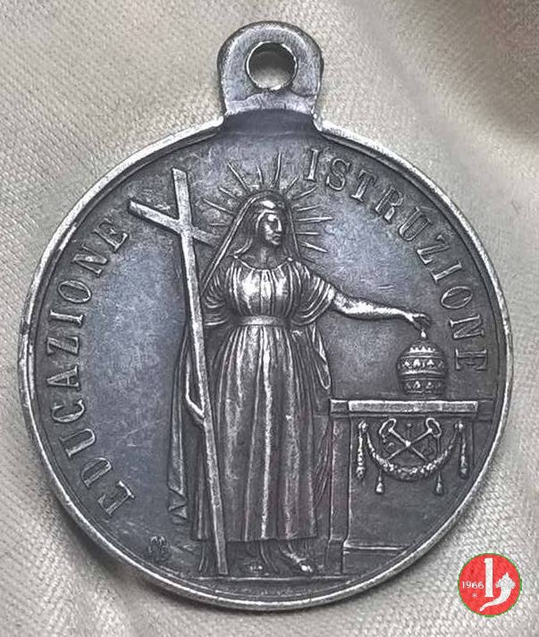 la figura allegorica della Religione velata, con volto raggiante, in piedi e volta a dx, regge Croce astile e indica triregno posto su ara decorata con chiavi decussate su festone