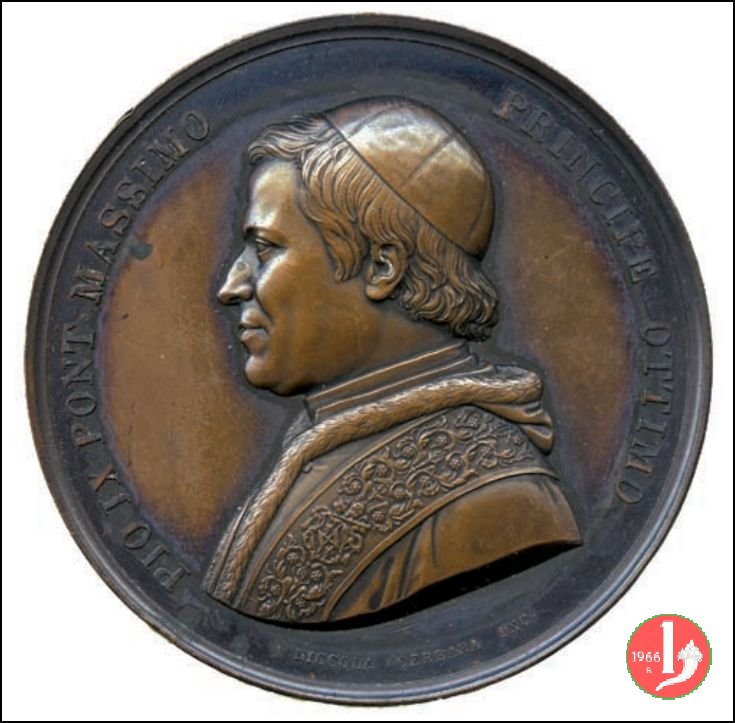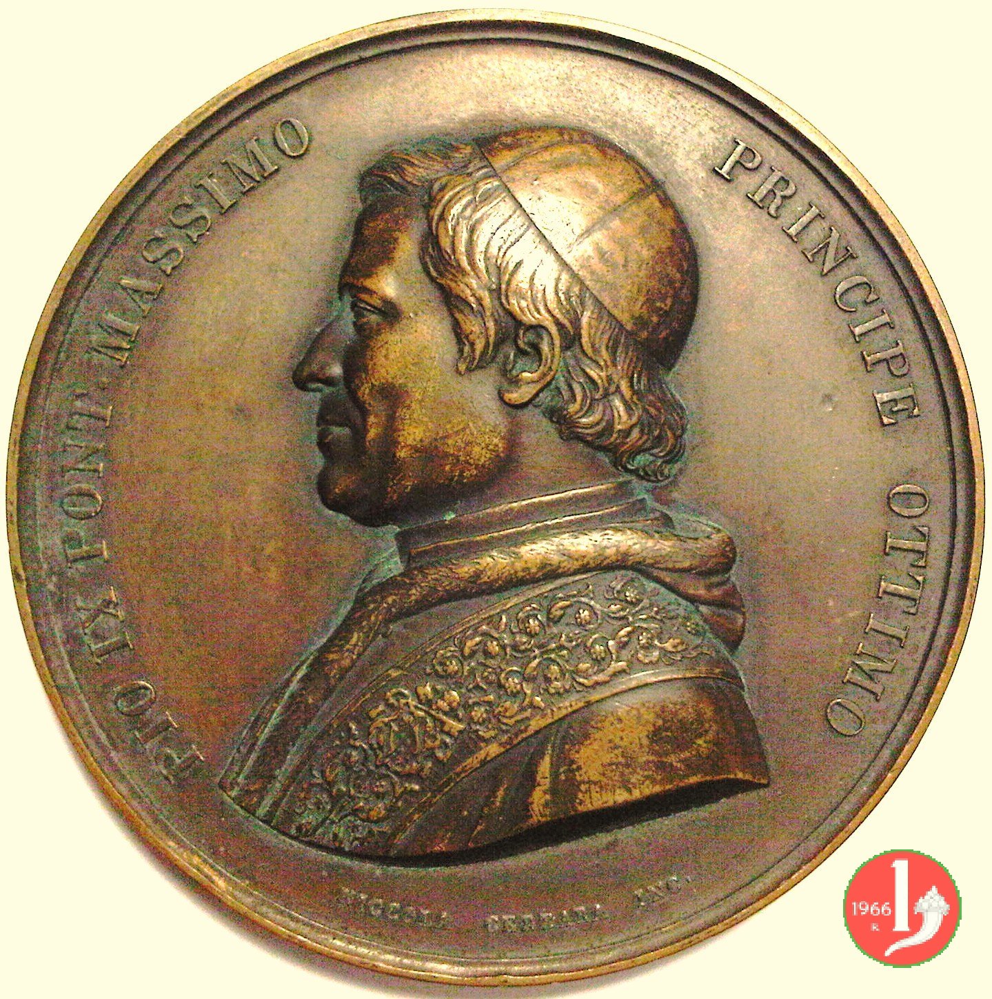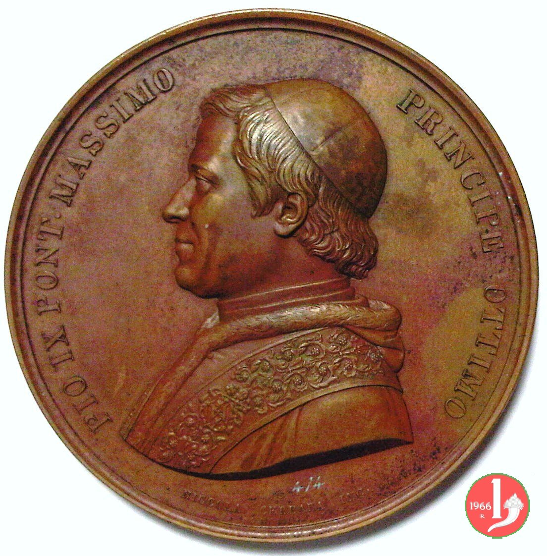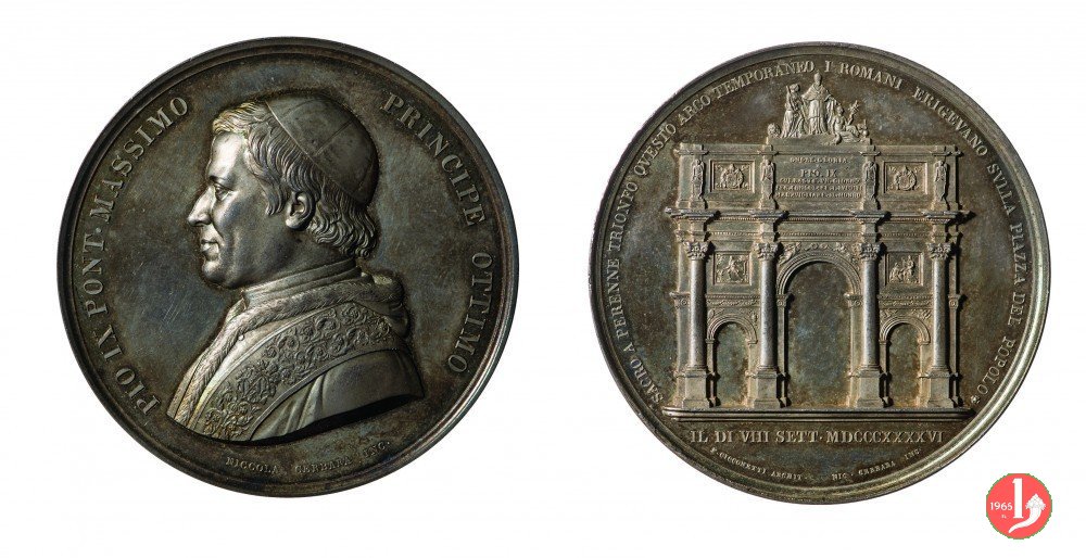 Medaglia coniata, emessa il 08-09-1846, per ricordare la visita di Pio IX alla Basilica di S.Maria del Popolo in Roma nel giorno della natività di Maria. Nelle settimane precedenti un comitato spontaneo popolare, composto tra gli altri da Ciceruacchio, decise di costruire un arco di trionfo temporaneo in legno, da collocarsi all'ingresso di Piazza del Popolo, dal lato di Via del Corso, via attraverso la quale sarebbe transitato il corteo papale. Autore del progetto dell'Arco fu l'architetto Felice Cicconetti, i materiali e la mano d'opera, quando non offerti direttamente, furono pagati con le offerte dei cittadini e inoltre prestarono la loro opera vari artisti per le decorazioni. La medaglia è contromarcata sul contorno ad ore sei con un punzone rappresentante una "Testa di Minerva", simbolo della Zecca di Roma. Venivano cosí punzonate le medaglie commissionate non direttamente dallo stato Pontificio, nella fattispecie questa fu commissionata dalla Camera Capitolina. Le seguenti notizie pervengono dalla sintesi tratta dall'intervento di Eldorado di cui alla: