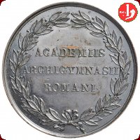 Medaglia premio annuale coniata. Per i Professori dell'Università di Roma. Venivano coniate medaglie piú o meno pesanti a seconda del premio meritato. Esiste della stessa un diverso dritto con la posizione della data continua (non distaccata) da ANNO di seguito classificata con il Cat. Bart. I-37 / a • | ||||||||