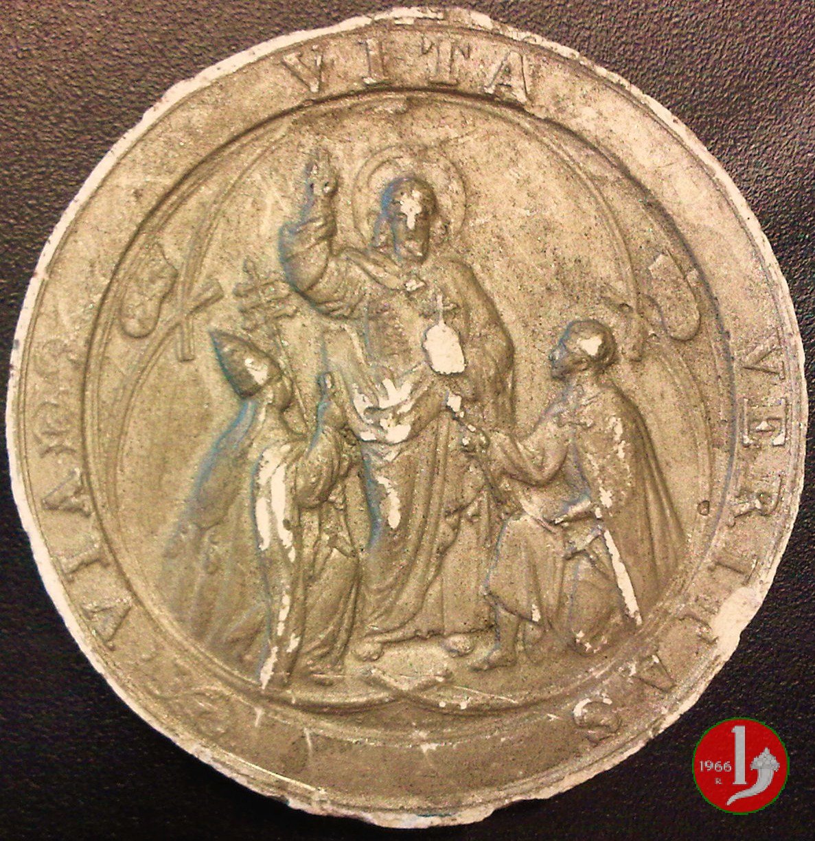 Cristo in piedi di fronte benedicente il Papa e l'Imperatore genuflessi