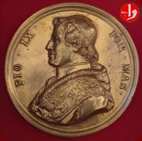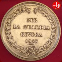 | Medaglia fusa, emessa il 31-07-1847 a ricordo dell'istituzione della Guardia Civica con il compito di mantenere o ristabilire l'ordine pubblico, far rispettare le Leggi e affiancare, in caso di necessità, l'esercito regolare. Composta da cittadini tra i 21 e i 60 anni e suddivisa in 14 battaglioni, uno per ogni rione della Città di Roma. | |||||