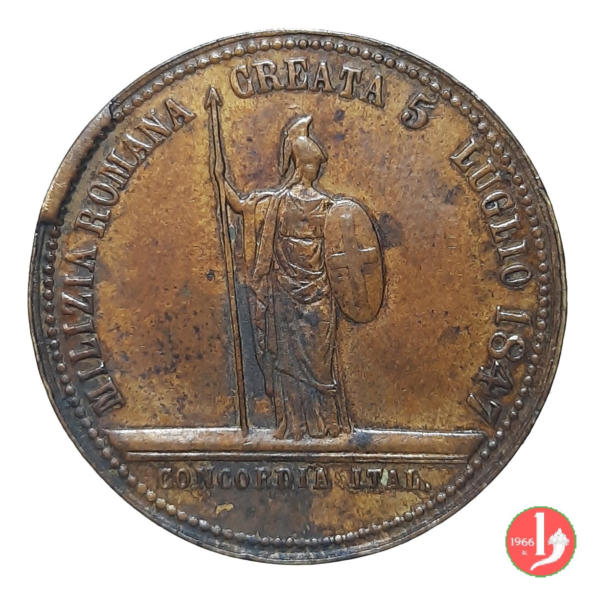 | Medaglia coniata, emessa il 31-07-1847 a ricordo dell'istituzione della Guardia Civica con il compito di mantenere o ristabilire l'ordine pubblico, far rispettare le Leggi e affiancare, in caso di necessità, l'esercito regolare. Composta da cittadini tra i 21 e i 60 anni e suddivisa in 14 battaglioni, uno per ogni rione della Città di Roma. | ||||