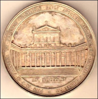 Medaglia straordinaria di massimo modulo coniata, emessa nel 1865 per ricordare le opere di ricostruzione della Basilica di San Paolo fuori le mura. | |||||||