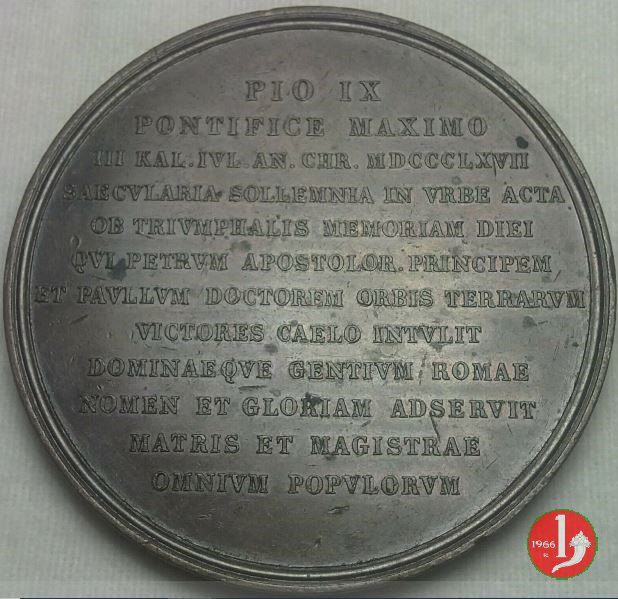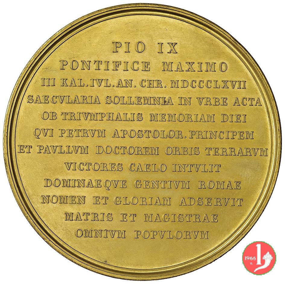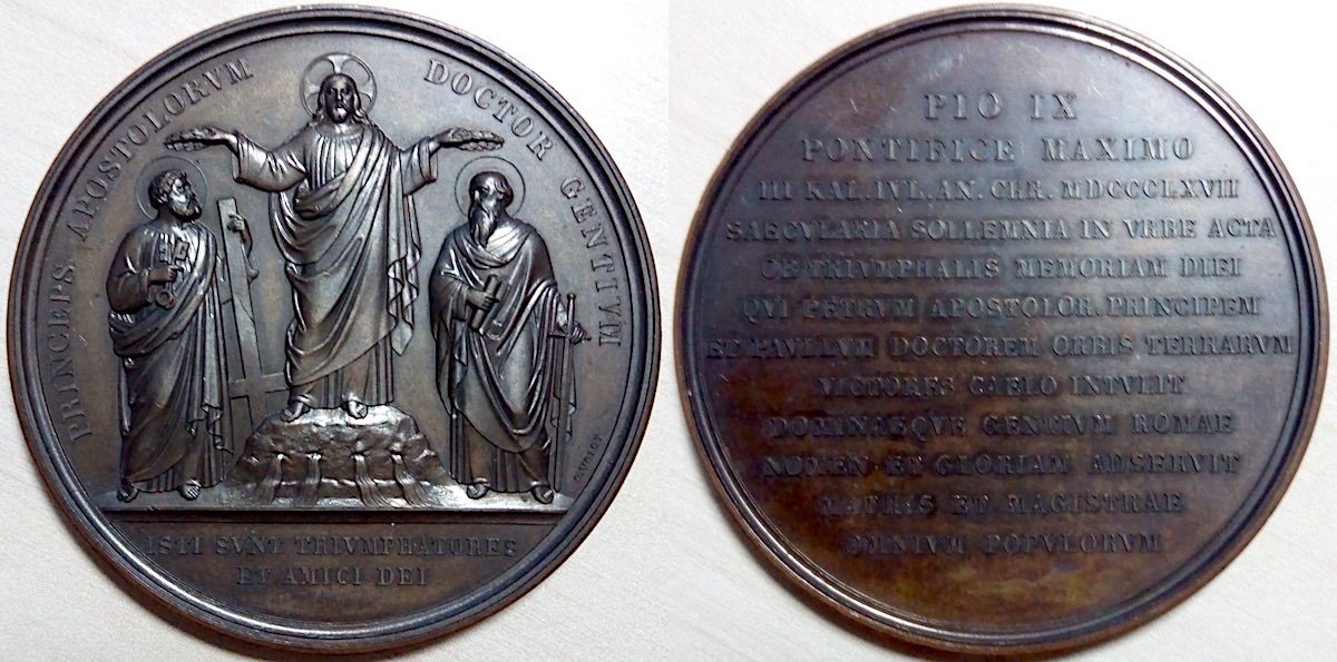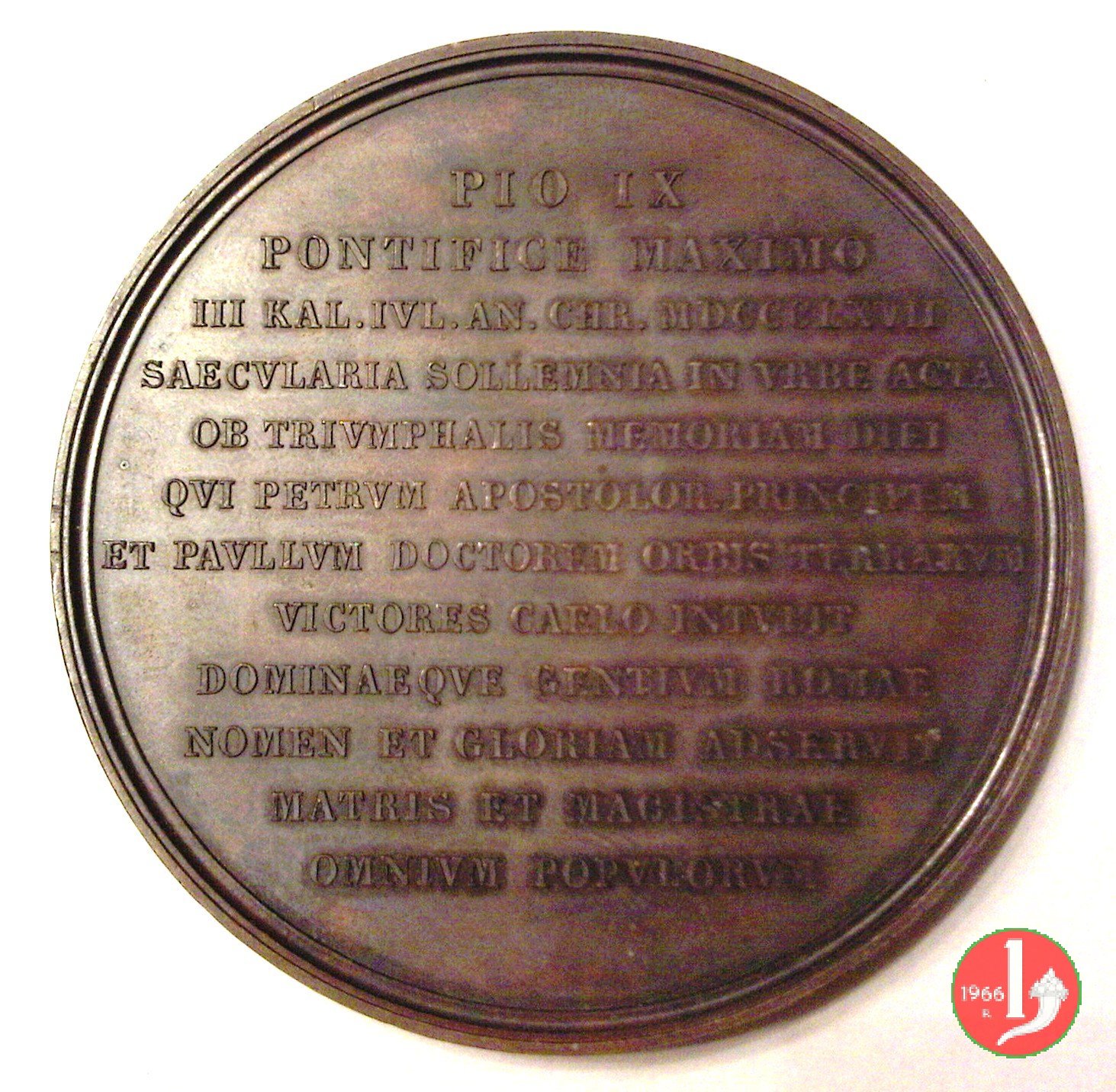 Medaglia straordinaria coniata, emessa il 29-06-1867, a ricordo del diciottesimo centenario del martirio dei SS. Apostoli Pietro e Paolo. Traduzione della legenda al Verso: "Pio IX Pontefice Massimo, il 3 luglio 1867 venne celebrata la solennità secolare nell' urbe per memoria del giorno trionfale che condusse vincitori in cielo Pietro principe degli apostoli e Paolo maestro del mondo e portò il nome e la gloria di Roma dominatrice delle genti, alla (chiesa) madre e maestra di tutti i popoli" (si ringrazia Eldorado) | |||||||
