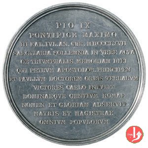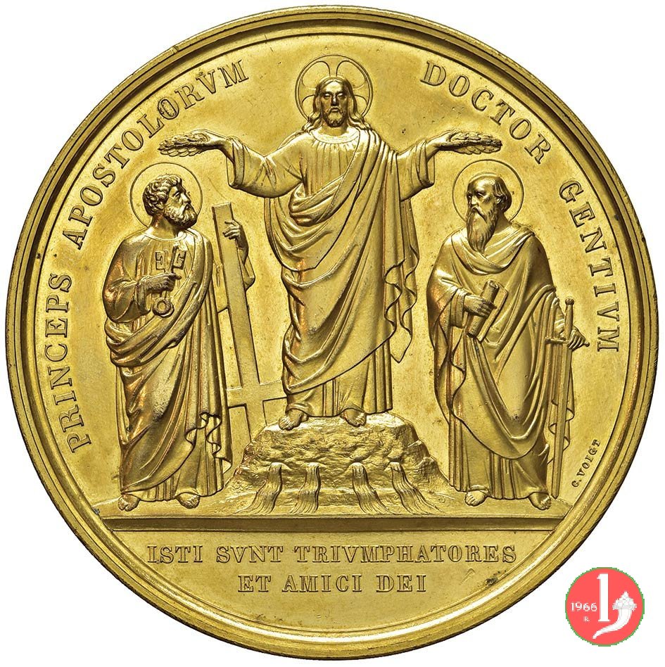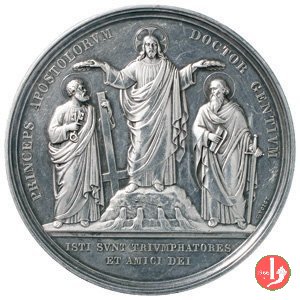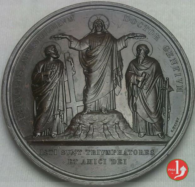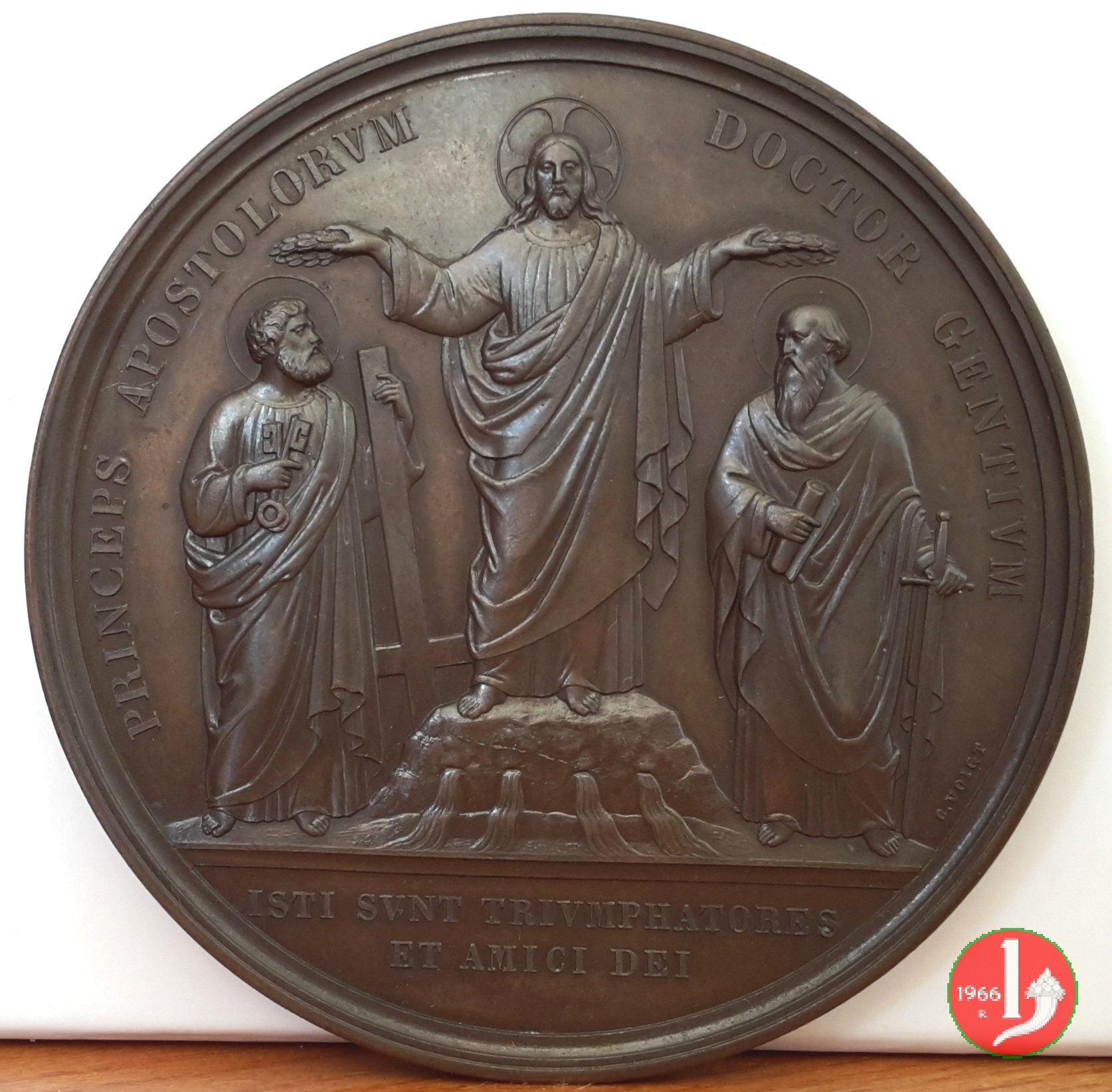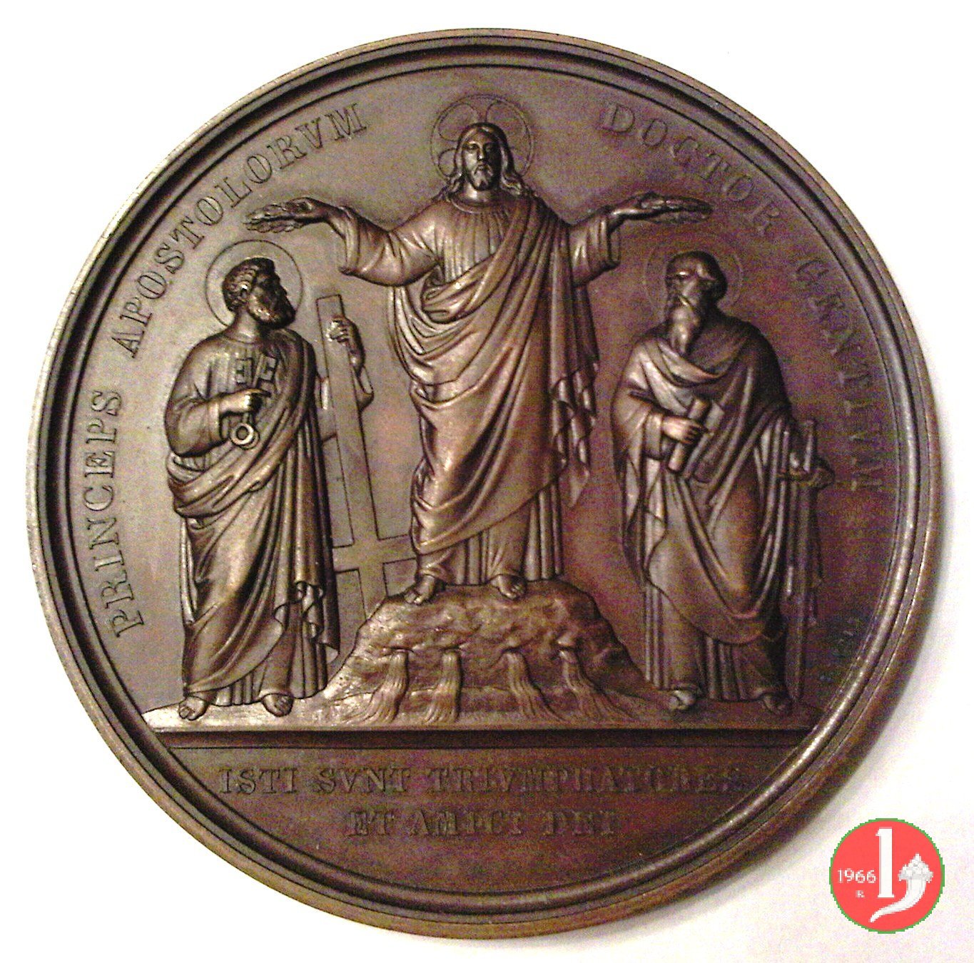 Medaglia straordinaria coniata, emessa il 29-06-1867, a ricordo del diciottesimo centenario del martirio dei SS. Apostoli Pietro e Paolo. Traduzione della legenda al Verso: "Pio IX Pontefice Massimo, il 3 luglio 1867 venne celebrata la solennità secolare nell' urbe per memoria del giorno trionfale che condusse vincitori in cielo Pietro principe degli apostoli e Paolo maestro del mondo e portò il nome e la gloria di Roma dominatrice delle genti, alla (chiesa) madre e maestra di tutti i popoli" (si ringrazia Eldorado) | |||||||
