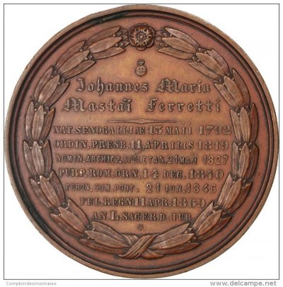 | Medaglia straordinaria coniata, realizzata nel 1869, a ricordo del cinquantesimo anniversario di Sacerdozio del Papa, omaggio dei Cattolici Belgi. | ||||||