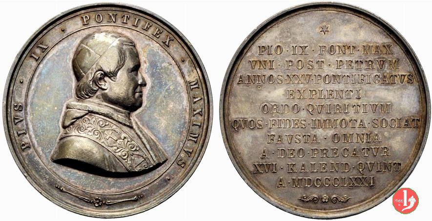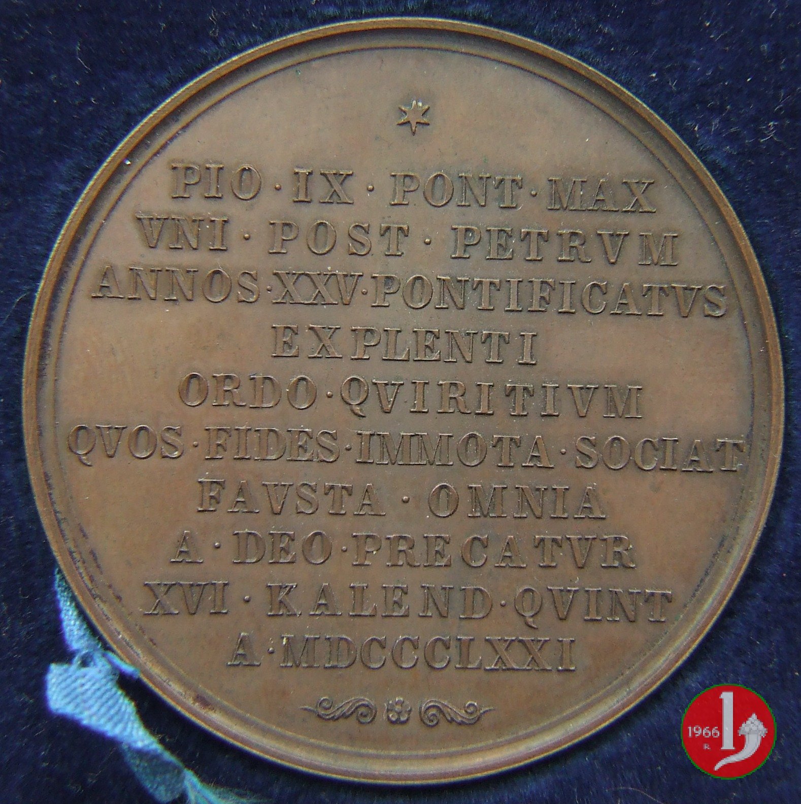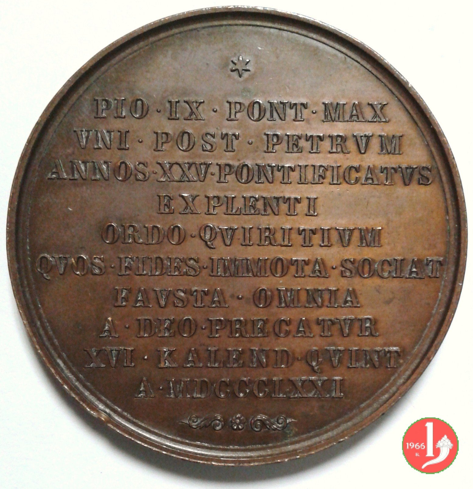 nel campo: * = PIO • IX • PONT • MAX = VNI • POST • PETRVM = ANNOS XXV • PONTIFICATVS = EXPLENTI = ORDO • QVIRITIVM = QVOS • FIDES • IMMOTA • SOCIAT = FAVSTA • OMNIA = A • DEO • PRECATVR = XVI • KALEND • QVINT = A • MDCCCLXXI = fregio