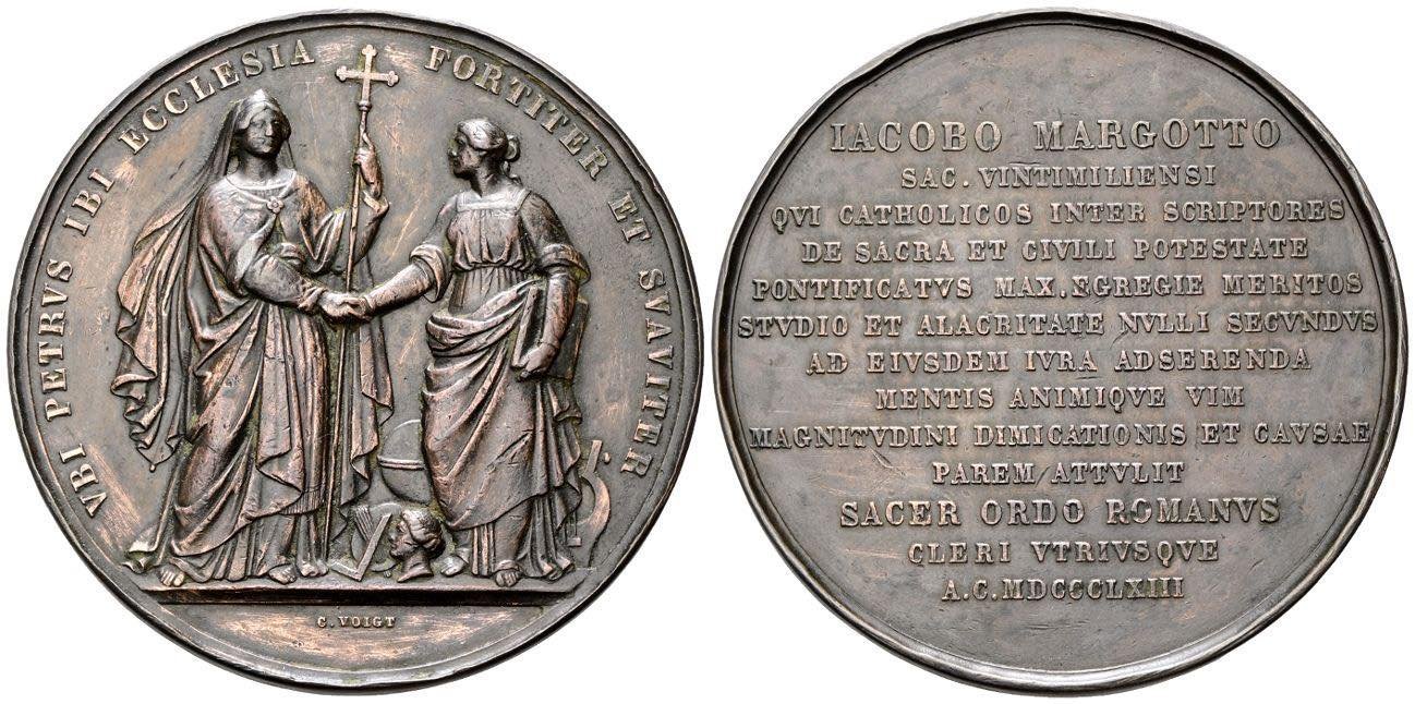 Medaglia coniata, realizzata nel 1868 in onore a Giacomo Margotti (1823-1887), sacerdote e giornalista. Vedi anche Cardinalizie e Vescovili.