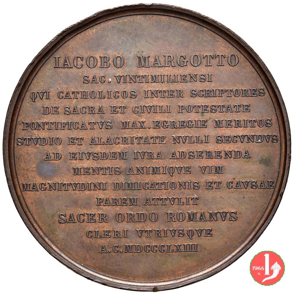 nel campo: IACOBO MARGOTTO = SAC. VINTIMILIENSI = QVI CATHOLICOS INTER SCRIPTORES = DE SACRA ET CIVILI PODESTATE = PONTIFICATVS MAX. EGREGIE MERITOS = STVDIO ET ALACRITATE NVLLI SECVNDVS = AD EIVSDEM IVRA ADSERENDA = MENTIS ANIMIQVE VIM = MAGNITVDINI DIMICATIONIS ET CAVSAE = PAREM ATTVLIT = SACER. ORDO ROMANVS = CLERI VTRIVSQVE = A.C. MDCCCLXIII