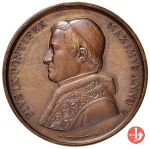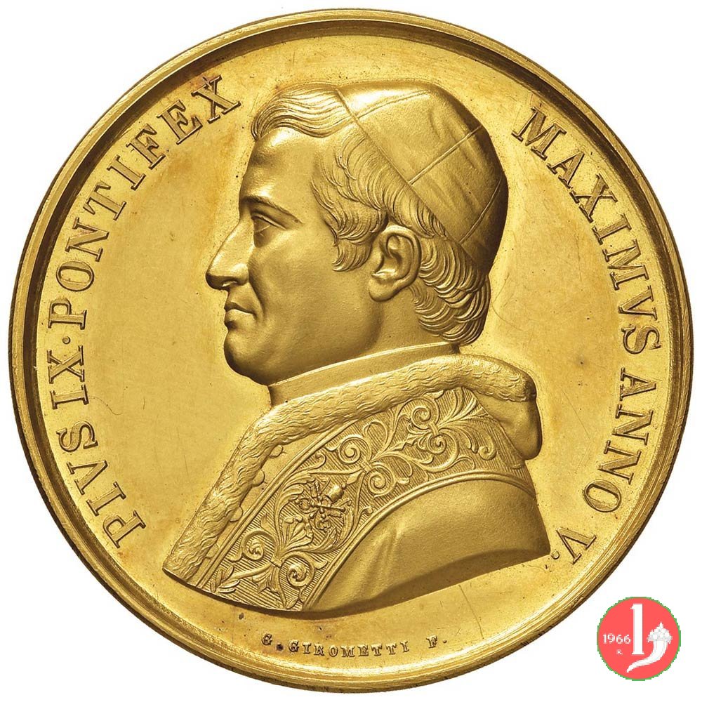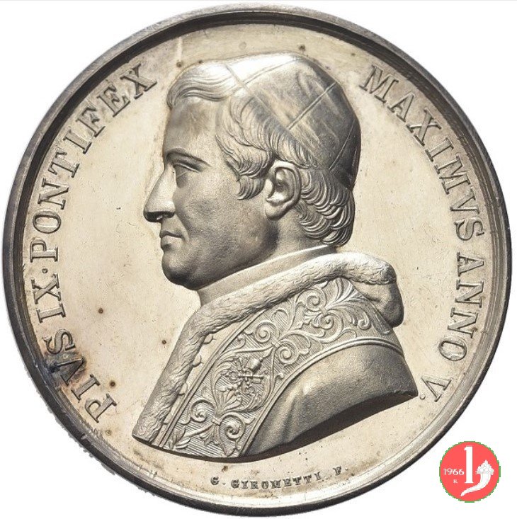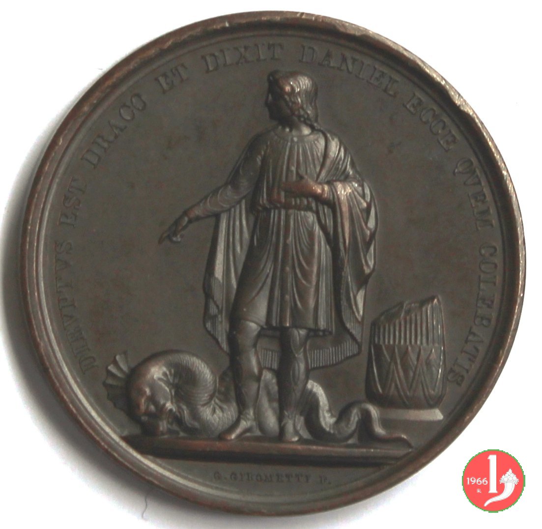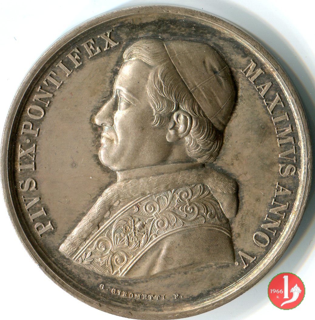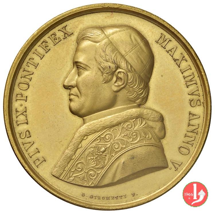 | Medaglia annuale coniata, emessa il 29-06-1850 a ricordo della caduta della Repubblica Romana e il rientro del Papa dall'esilio di Gaeta. | ||||||||