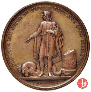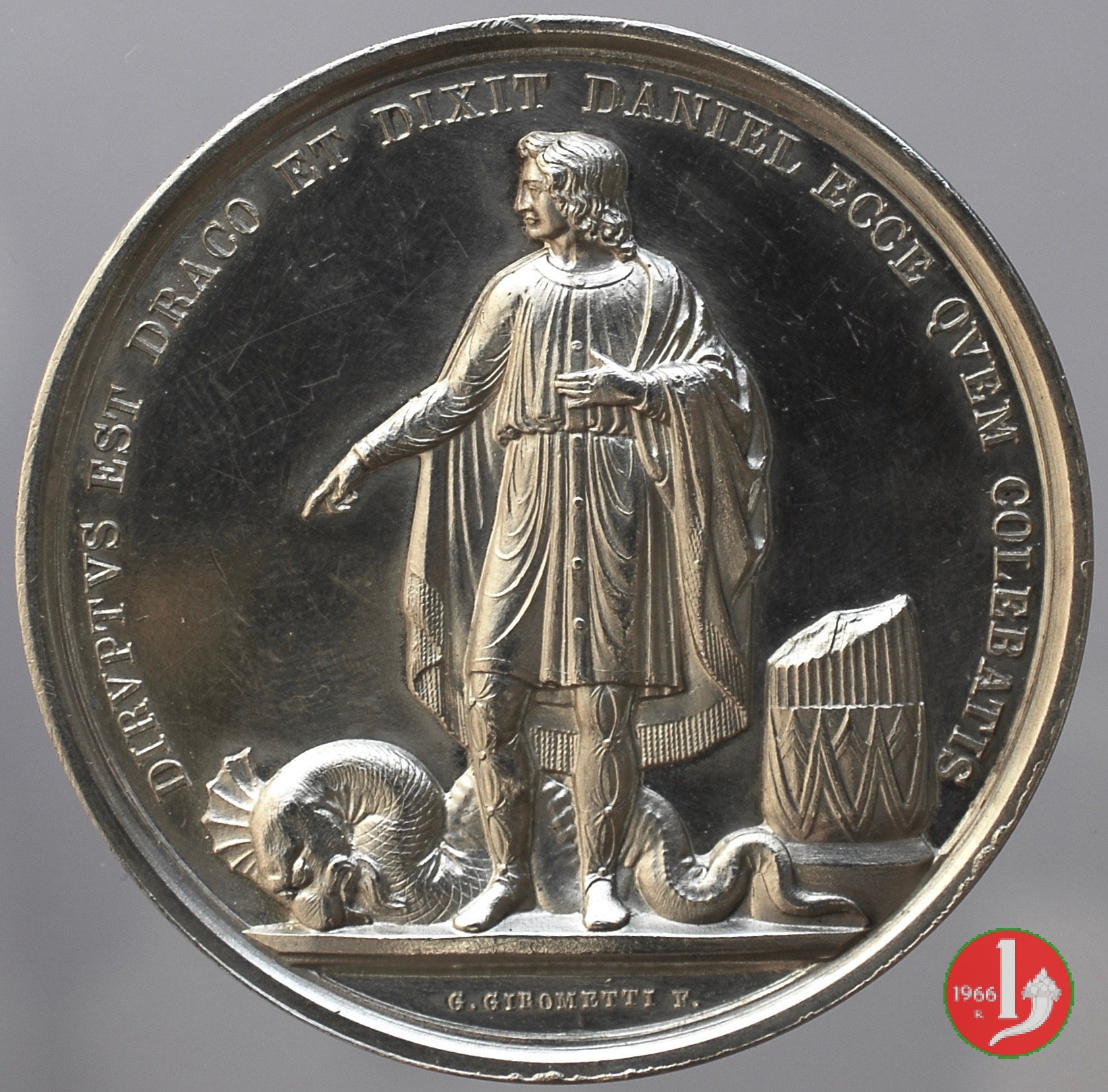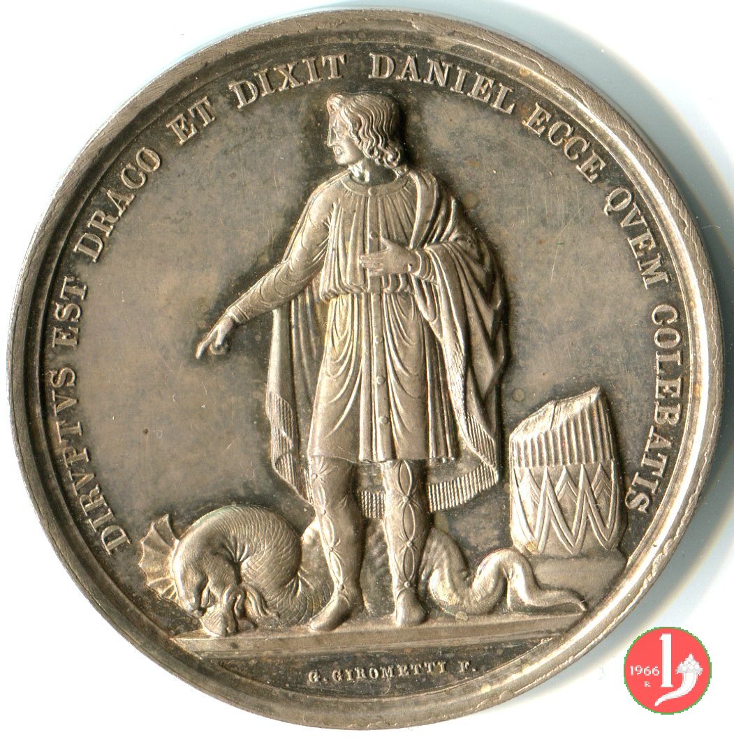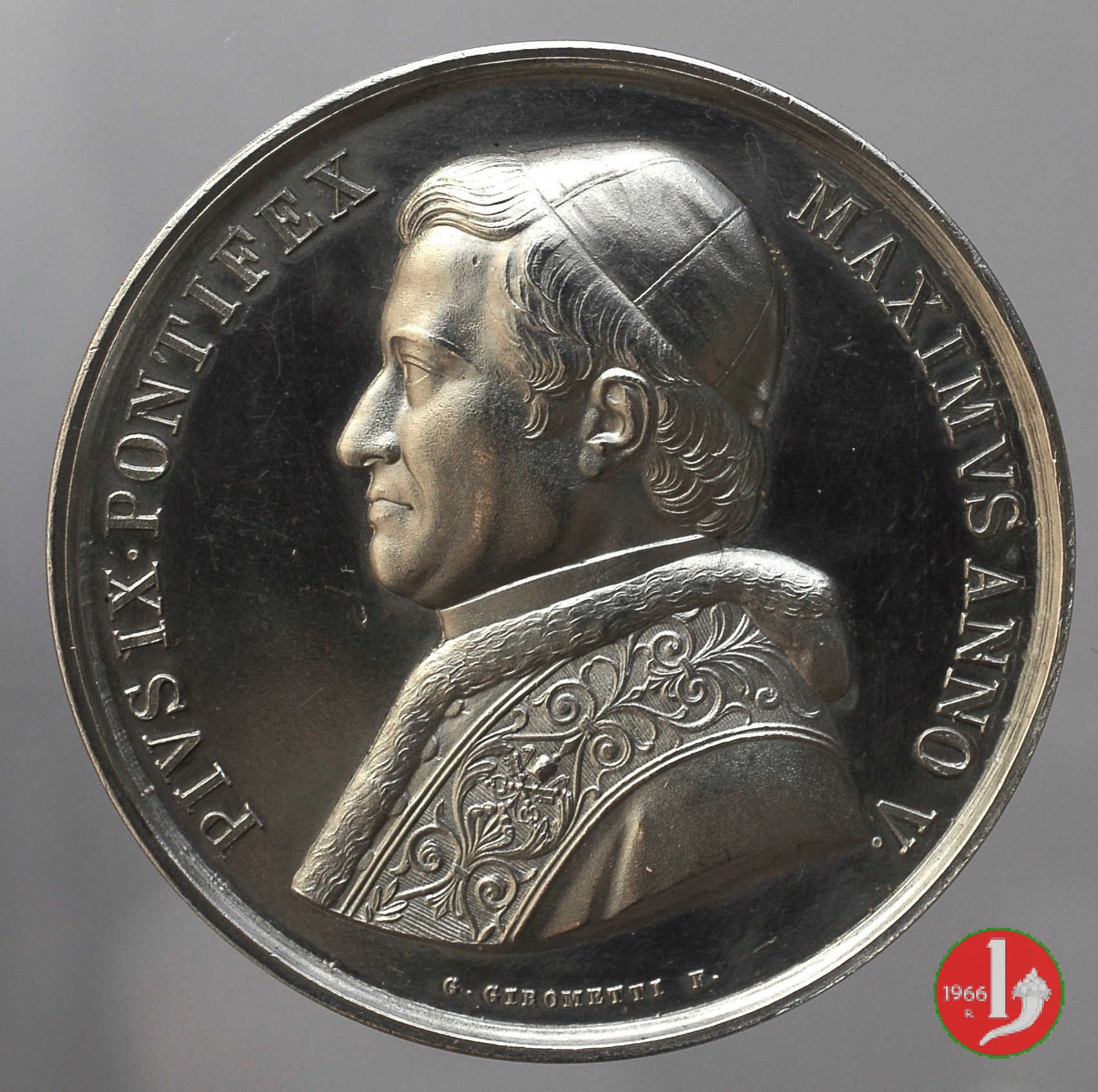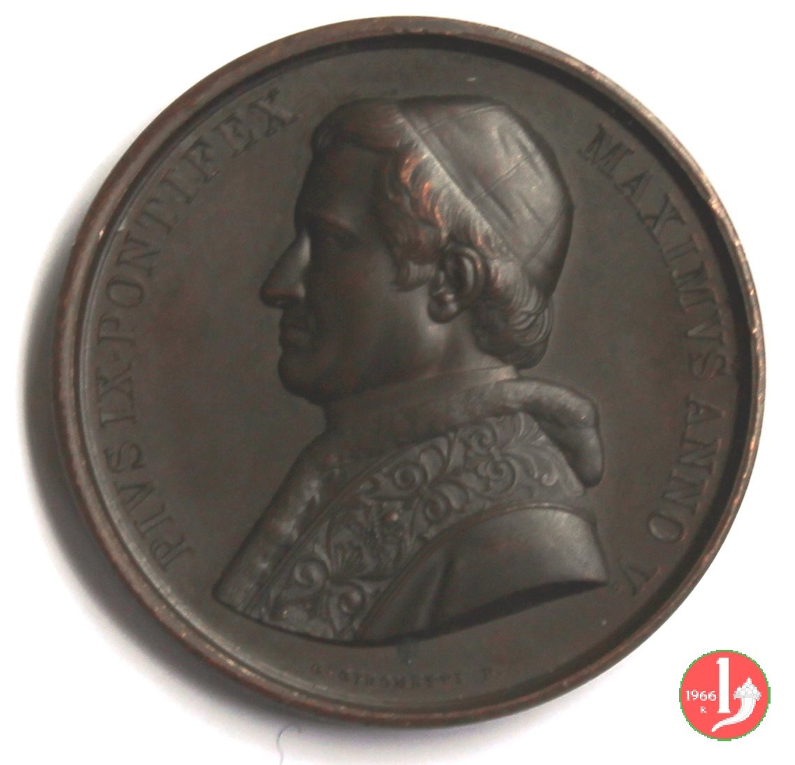 | Medaglia annuale coniata, emessa il 29-06-1850 a ricordo della caduta della Repubblica Romana e il rientro del Papa dall'esilio di Gaeta. | ||||||||