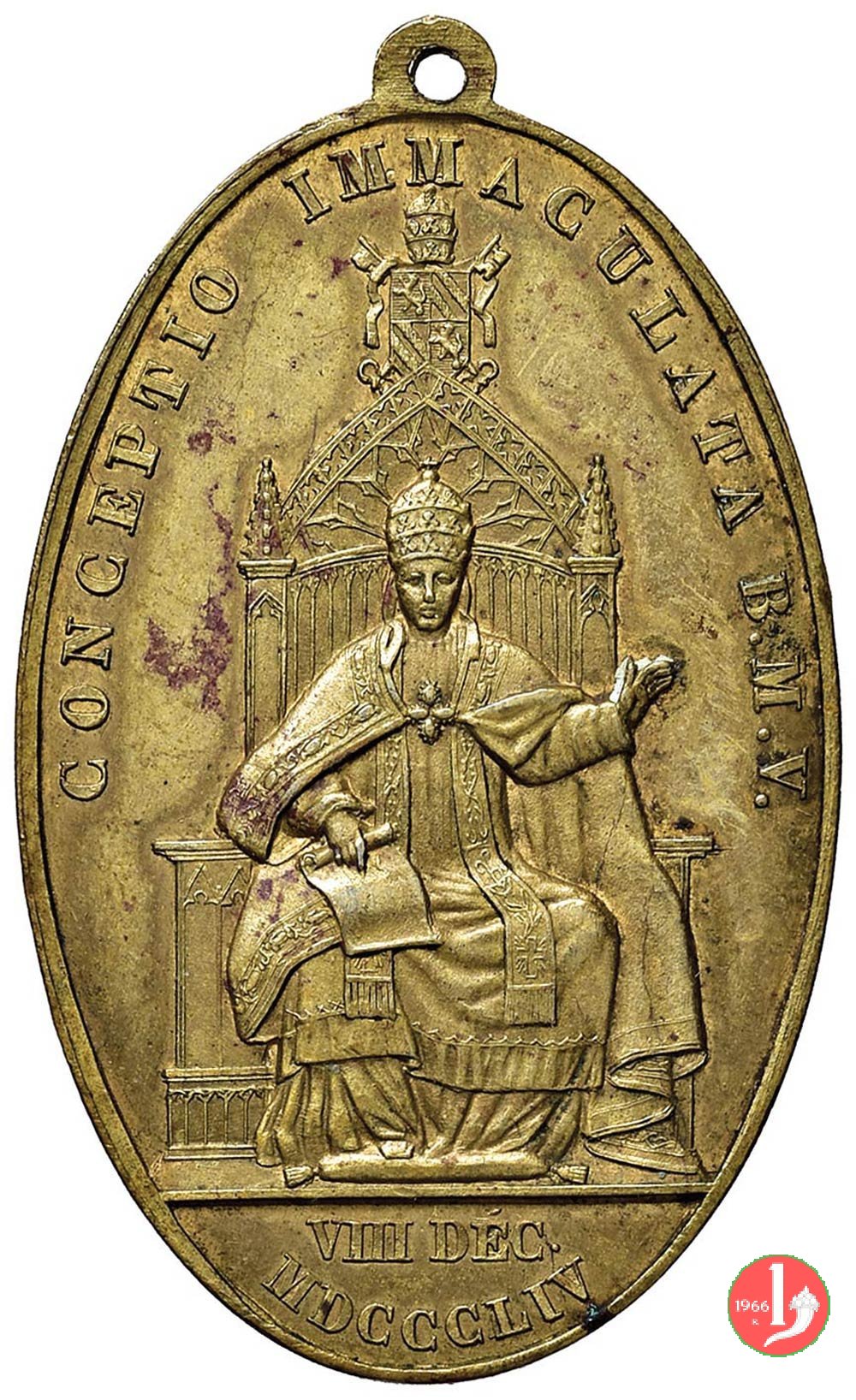 Il Papa benedicente, seduto di fronte, su trono sormontato dallo Stemma Papale, con triregno e piviale, regge la bolla di proclamazione del dogma
