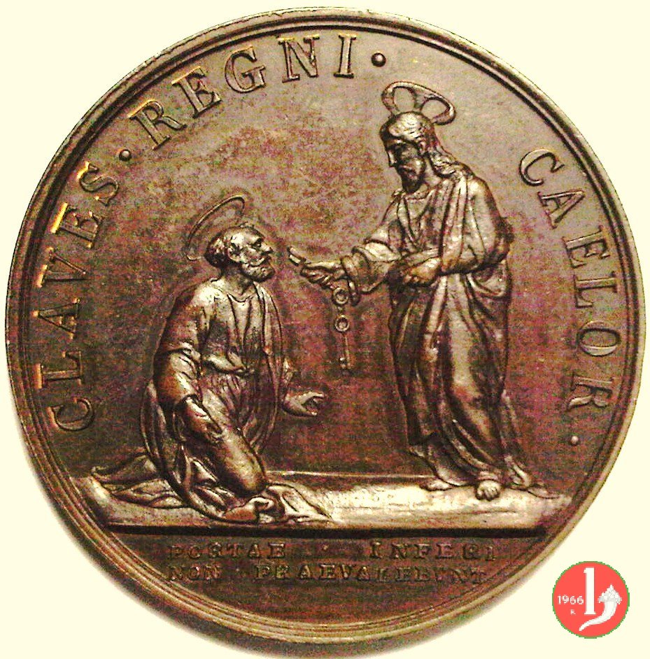 Gesú nimbato a dx, consegna le chiavi a S. Pietro genuflesso